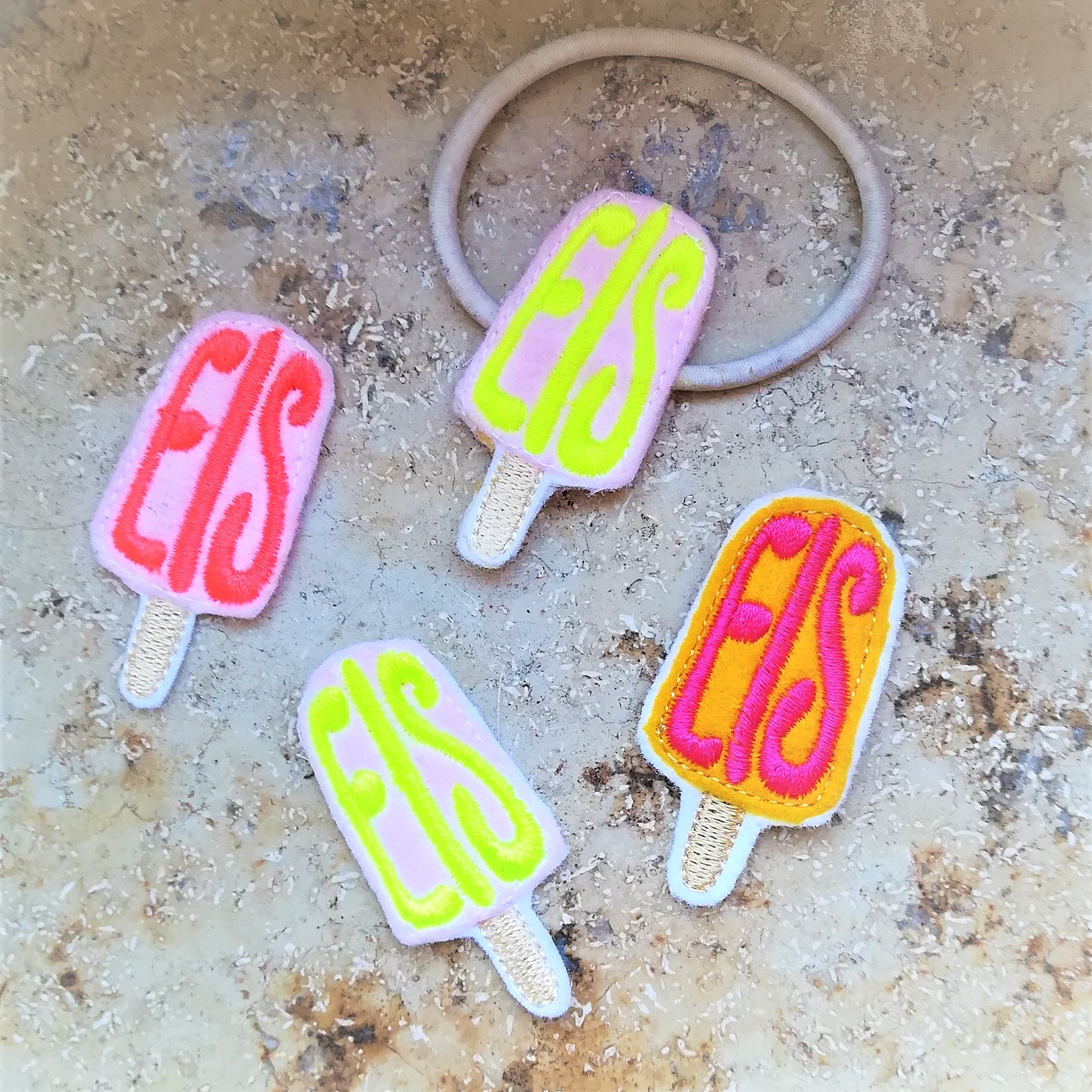 Schnell sind damit kleine Dekorationen gezaubert. Hier zeige ich euch auch mal ein verziertes Haargummi: einfach 2 mal die Stickerei, ausgeschnitten und mit einem Haargummi dazwischen zusammengeklebt und ordentlich festgepresst.
