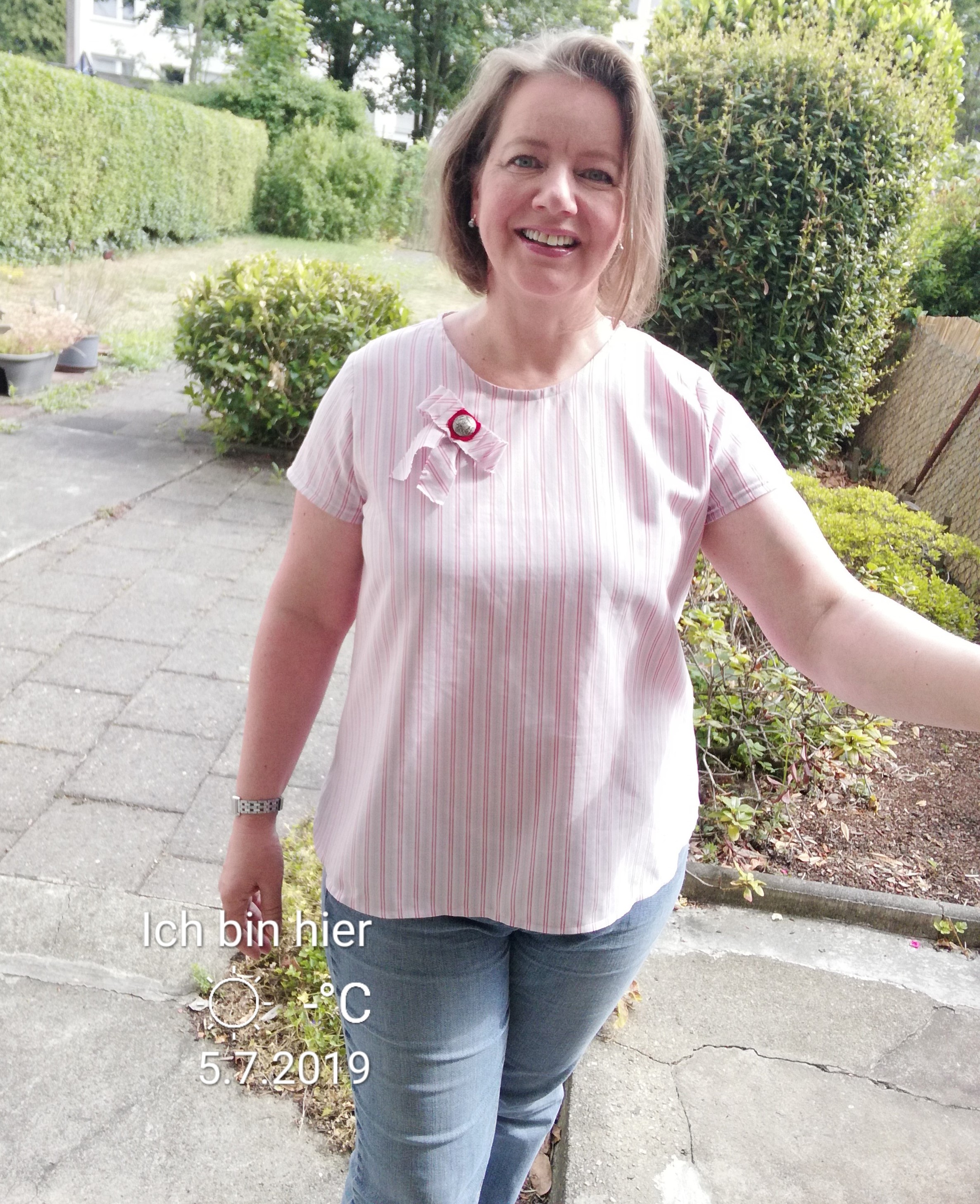 Ein ganz leichtes und leicht zu nähendes Sommerblüschen hat bisher als Schnitt in meinem Fundus geschlummert. Aus der Nähtrends 2/16, ohne Abnäher, mit Schlitz und Knopfverschluss. Die Schleife mußte dran war mir sonst doch zu schlicht mit dem Stoff. Herrlich locker zu tragen.