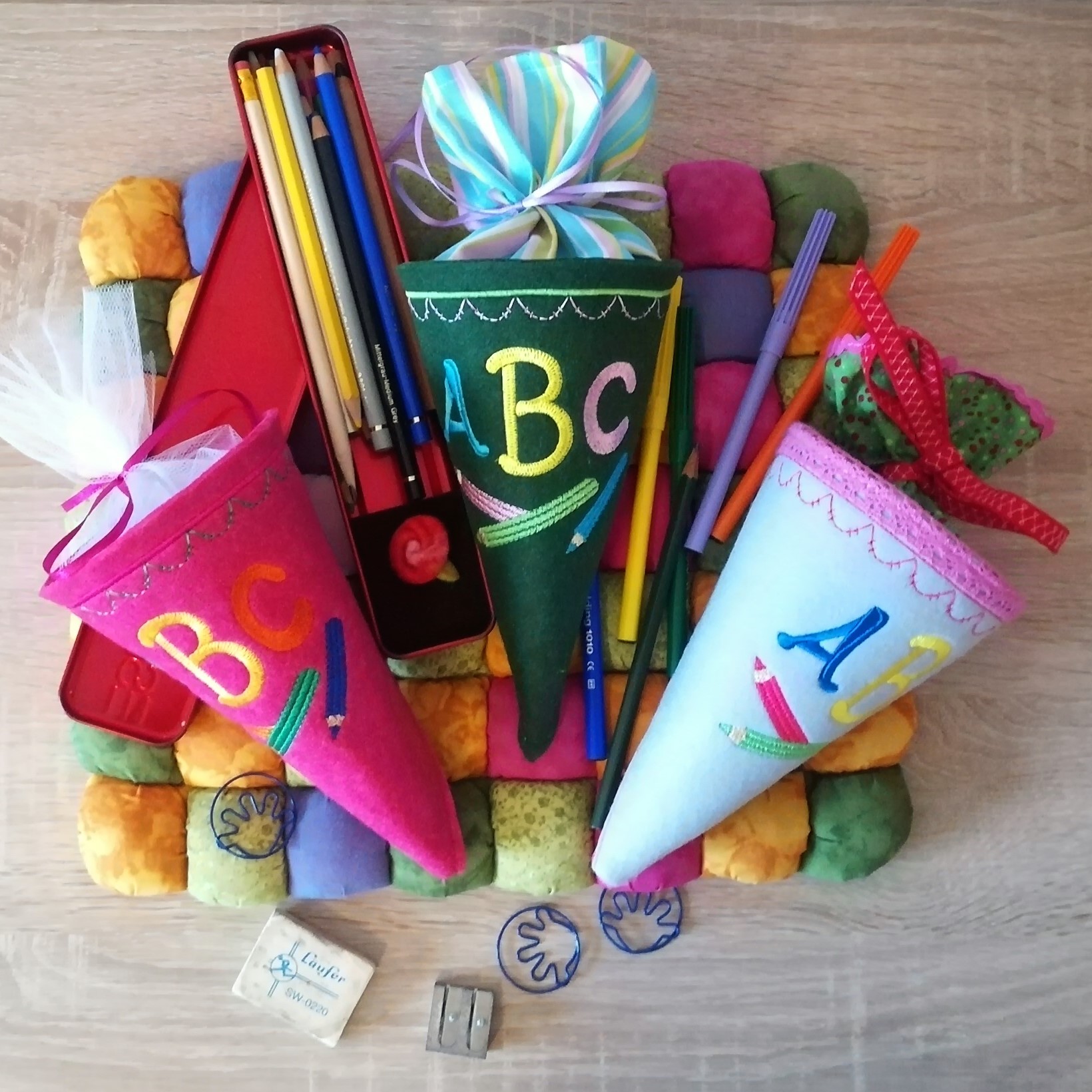 Ich habe lange getüftelt und probiert und bin jetzt sehr glücklich und freue mich über meine gestickten Schultüten!
