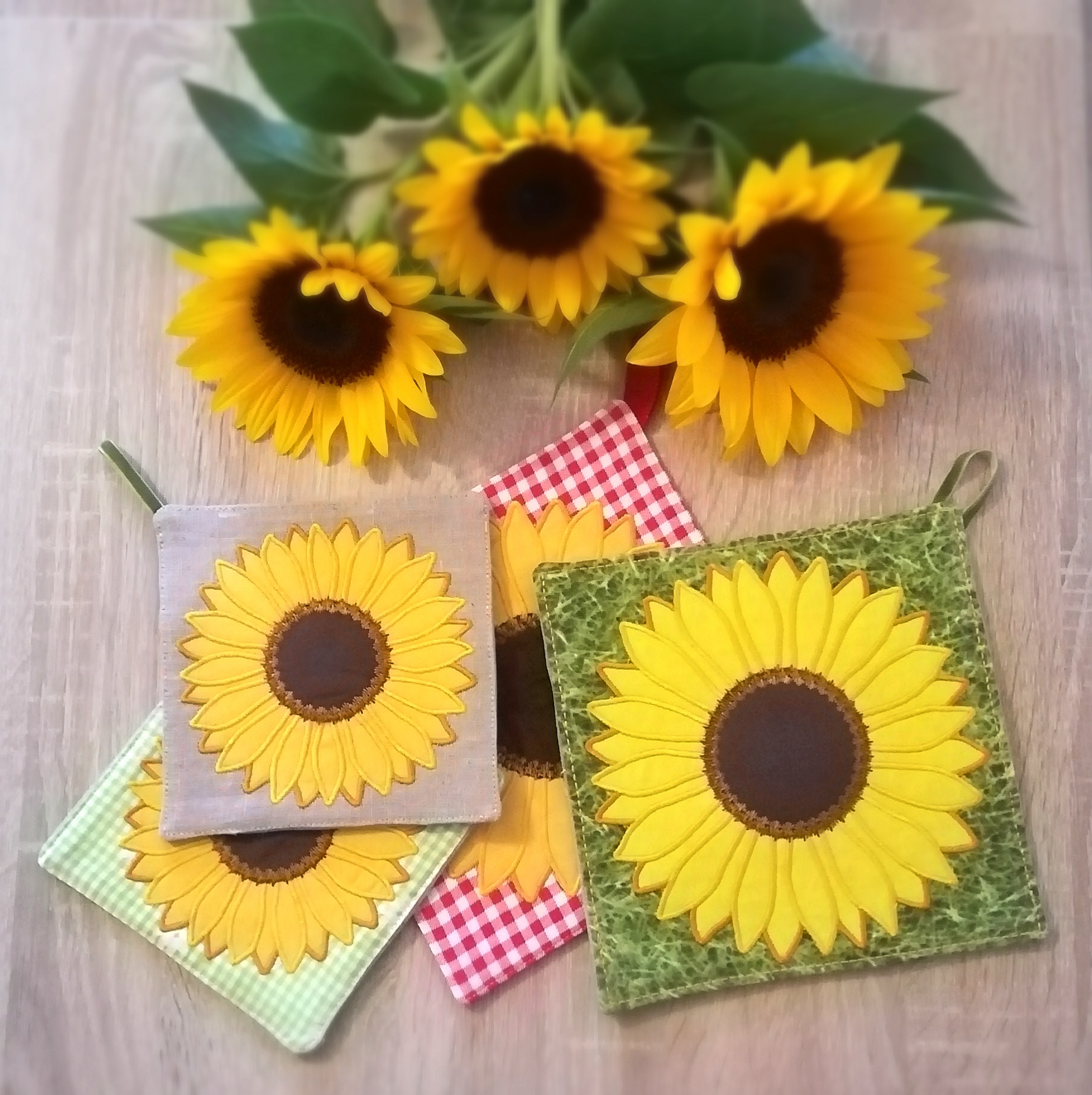 Ich habe eine ganze Kollektion an Untersetzern und Topflappen in den verschiedensten Größen ITH gestickt.