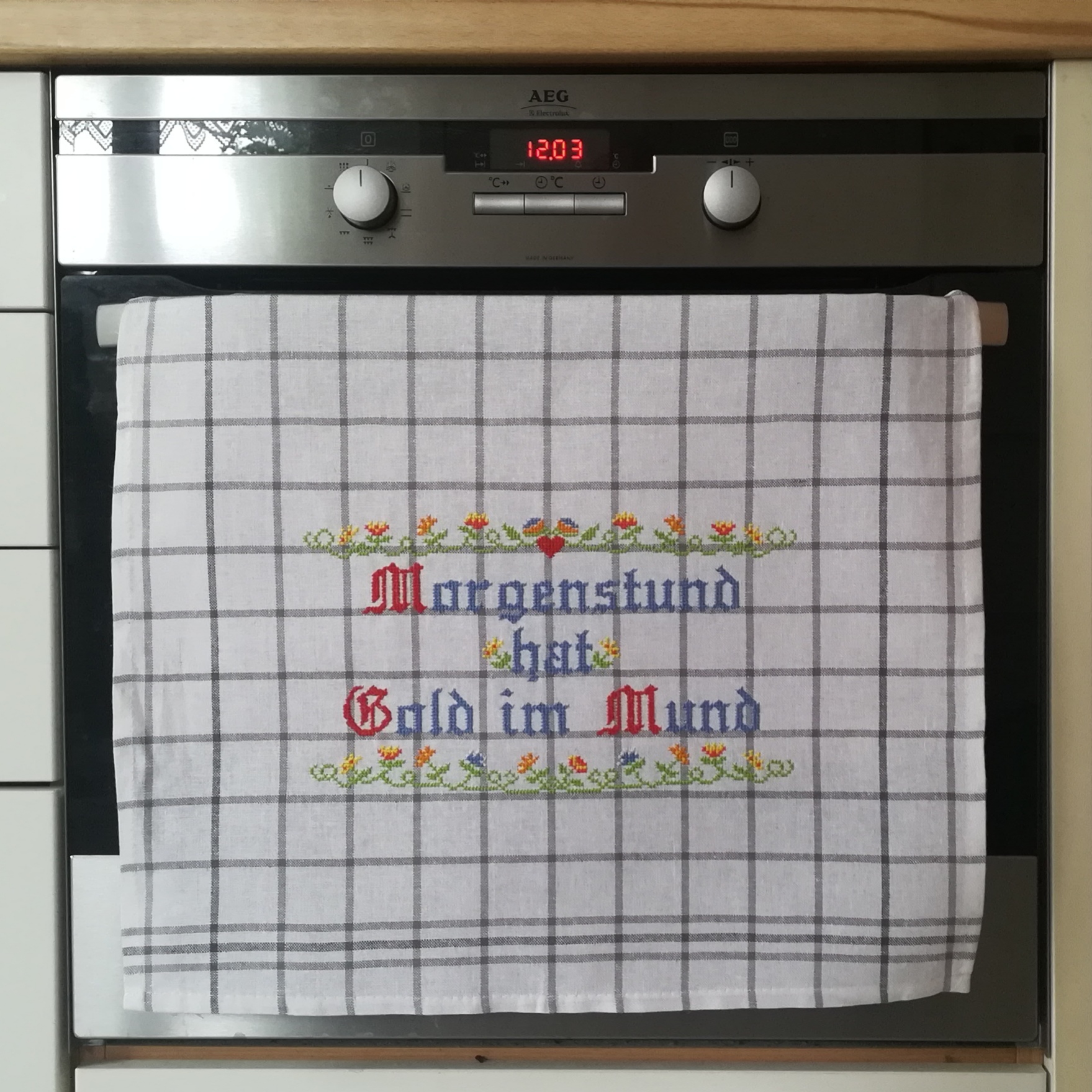 Hierfür habe ich das Geschirrtuch sogar ohne Stickvlies bestickt. Wie das geht, zeige ich auf meiner Facebookseite: