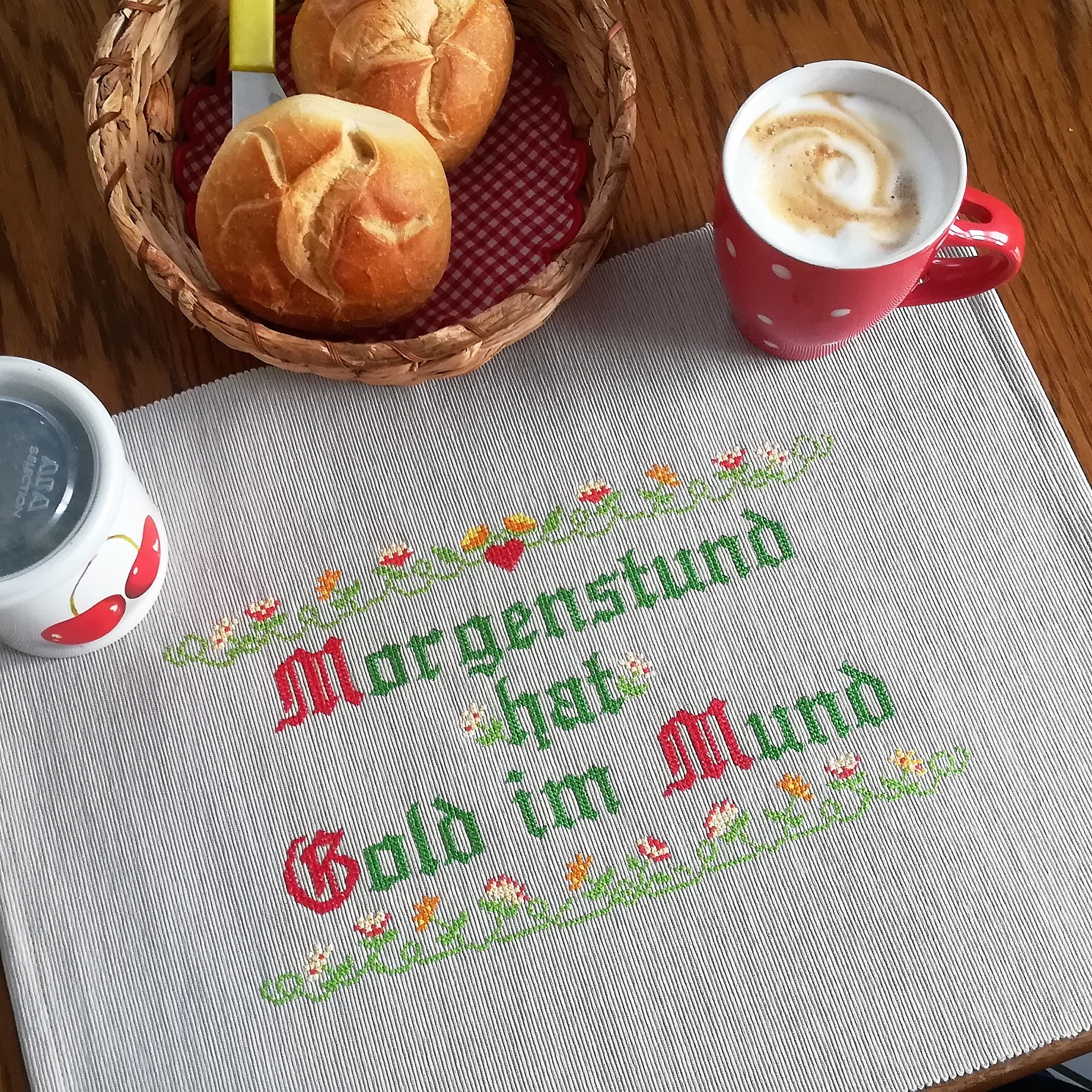 das ist mein neues Motto - und damit ich das auch nicht vergesse (Motivationshilfe) habe ich es mir direkt auf 2 Tischsets und ein Geschirrtuch gestickt!