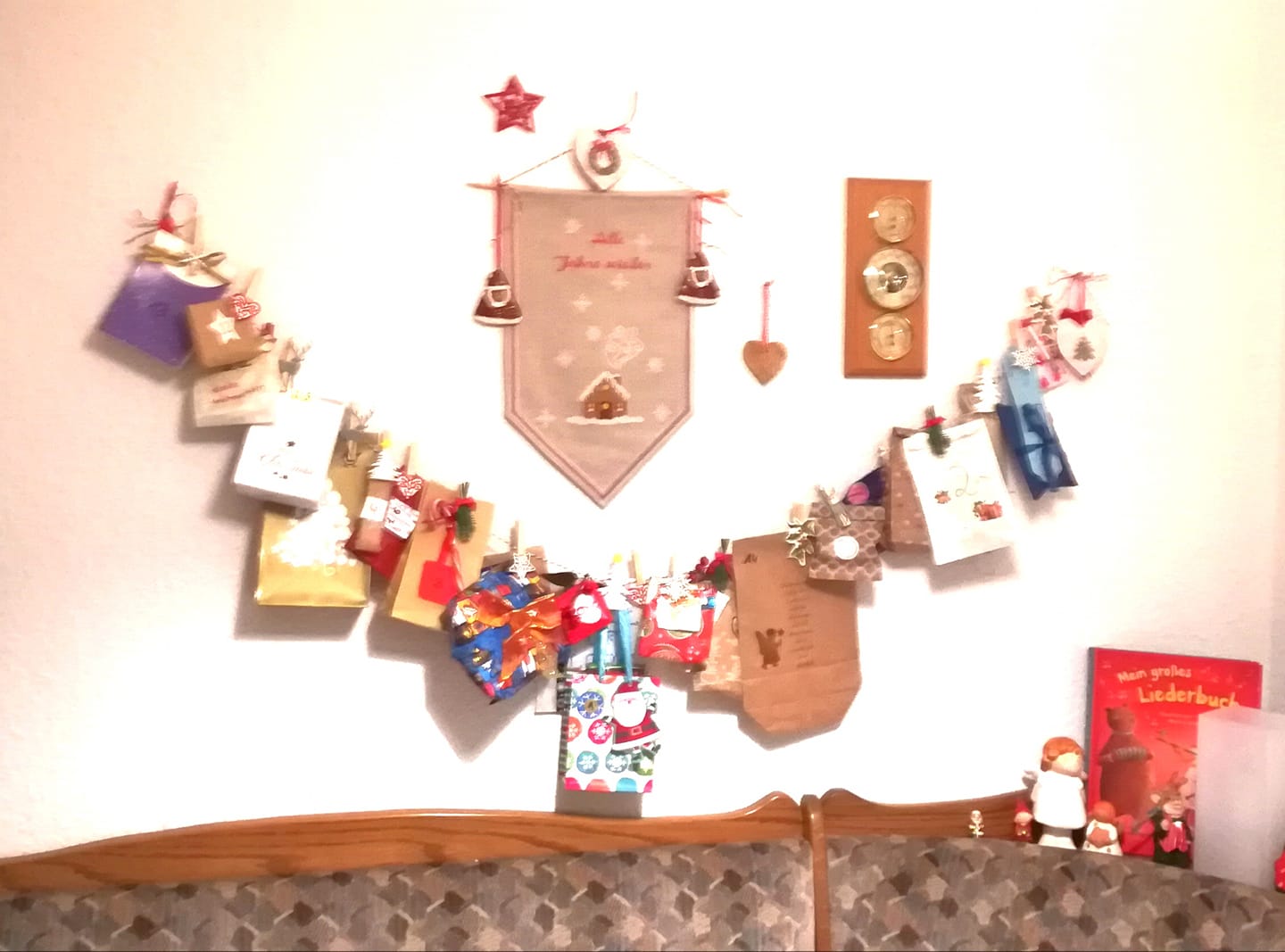 Mein Adventskalender mit lauter Nähzubehör hängt und ist mit dem Wandbehang vom letzten Jahr verziert.