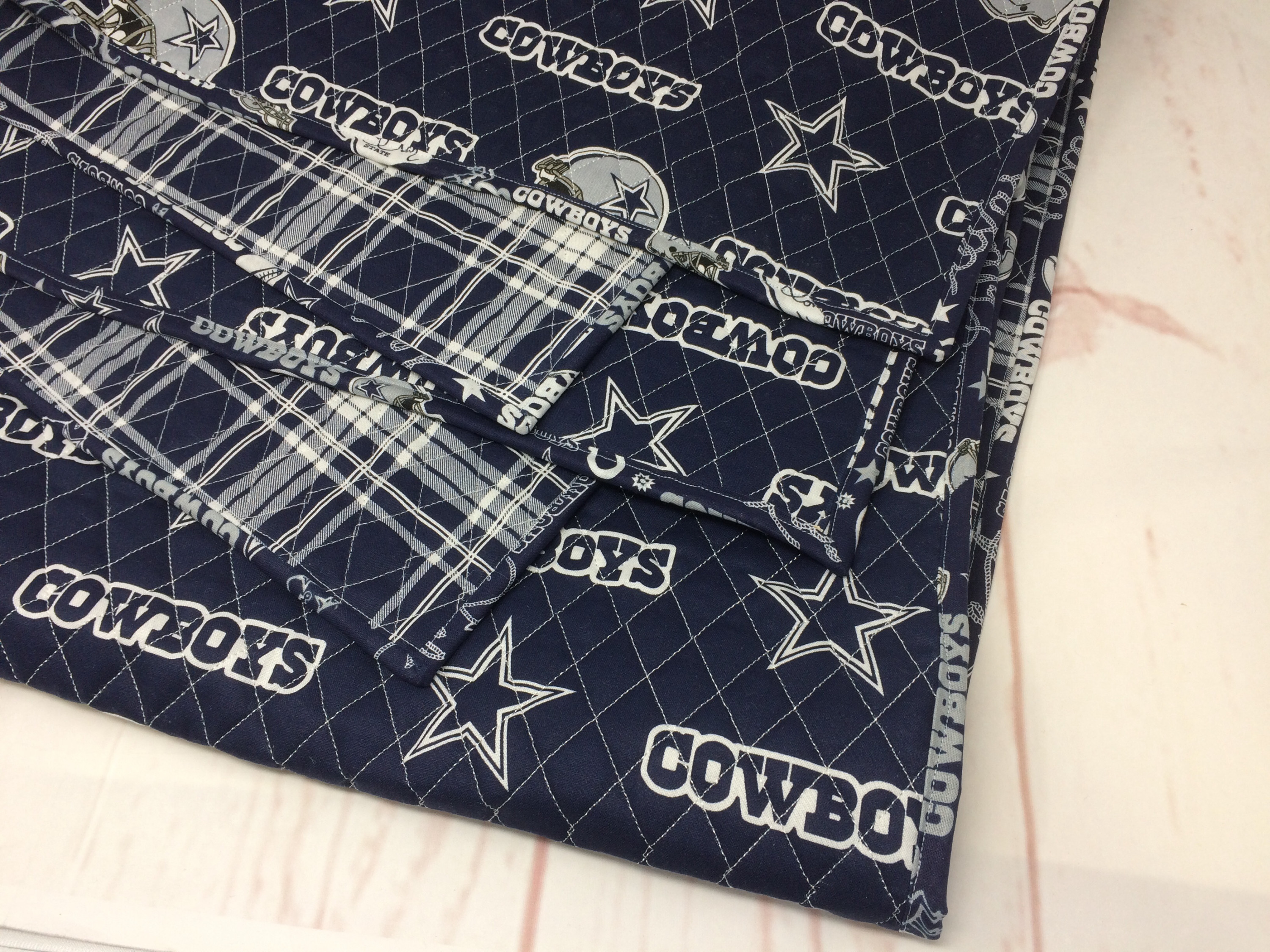 Fan-Stoffe sind hier schwer zu bekommen, also aus den USA mitgebracht. Der Stoff der Decke ist leicht wattiert und quadratisch abgesteppt. Vorne mit Cowboys Motiven, hinten einfach gemustert. Das Binding habe ich ebenfalls aus Cowboys-Baumwollstoff genäht.