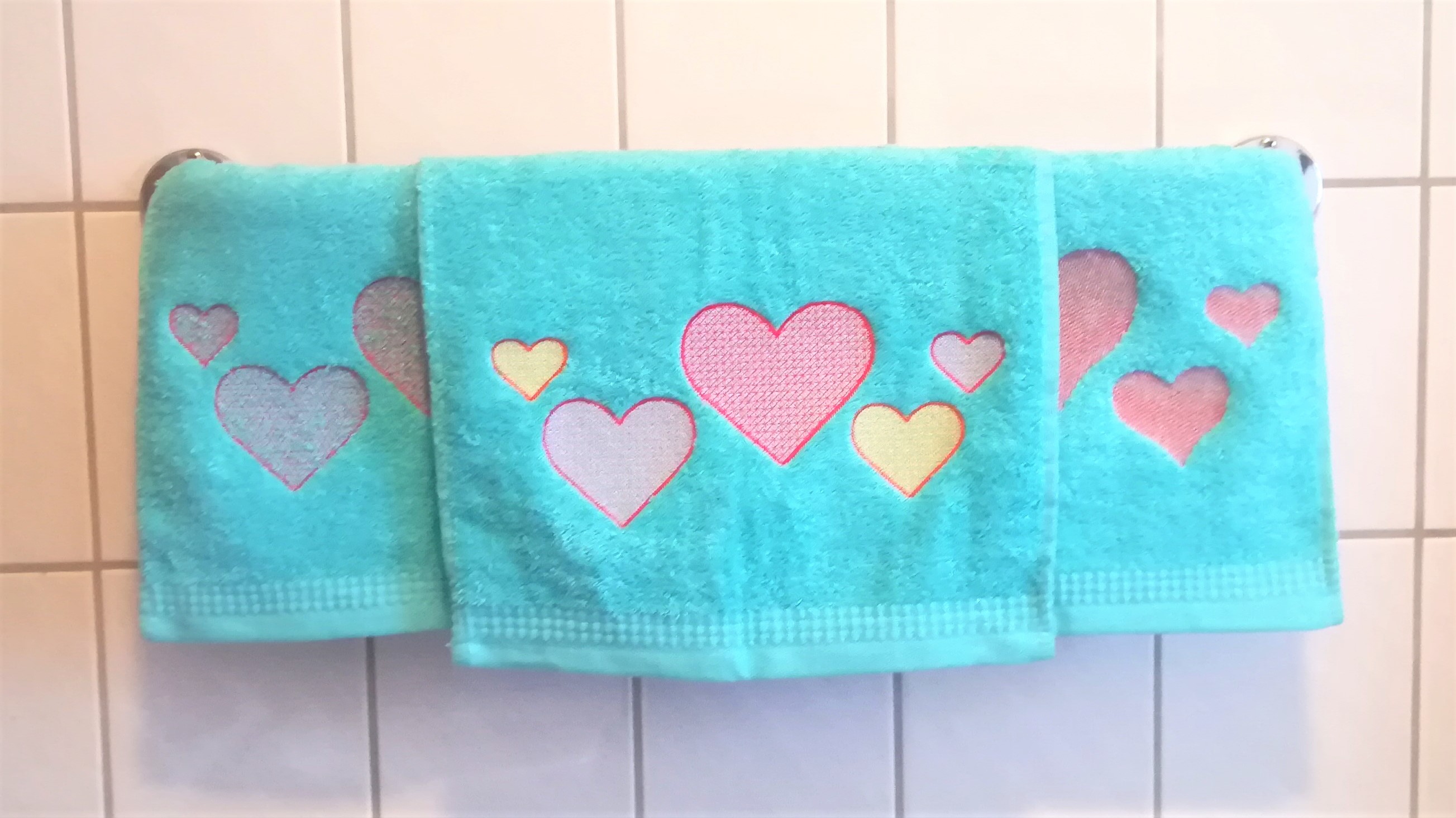 EIne kleine Serie Gästetücher habe ich mit Herzen in Gravur bestickt. Mit schraffierten Herzen und dem sogenannten "Knockdown" Stich. Herrlich filigran, weich und saugfähig bleiben die Tücher. ![]()