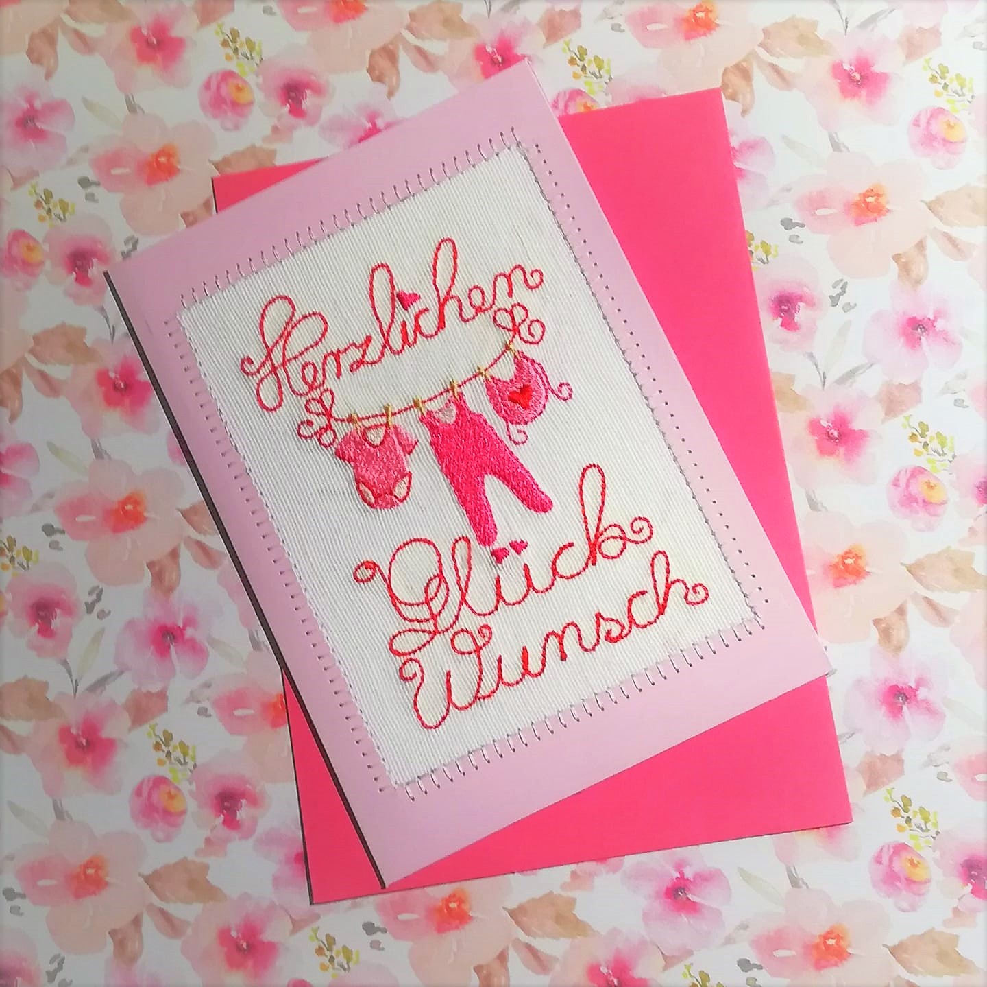 Mit einer hübschen Stickdatei, die ich speziell für Glückwünsche und Geschenke zur Geburt erstellt habe, ist diese Karte gestaltet. Es ist eine herkömmliche Karte, aus der ich das Passapartout zurechtgeschnitten habe, eine Pappe zum Hinterkleben ausgeschnitten und den Stoff dort aufgeklebt. die Karte dann dahintergeklebt und mit der Nähmaschine mit einem schönen Stich aufgenäht. So eine besondere Karte ist schon ein richtiges Geschenk!