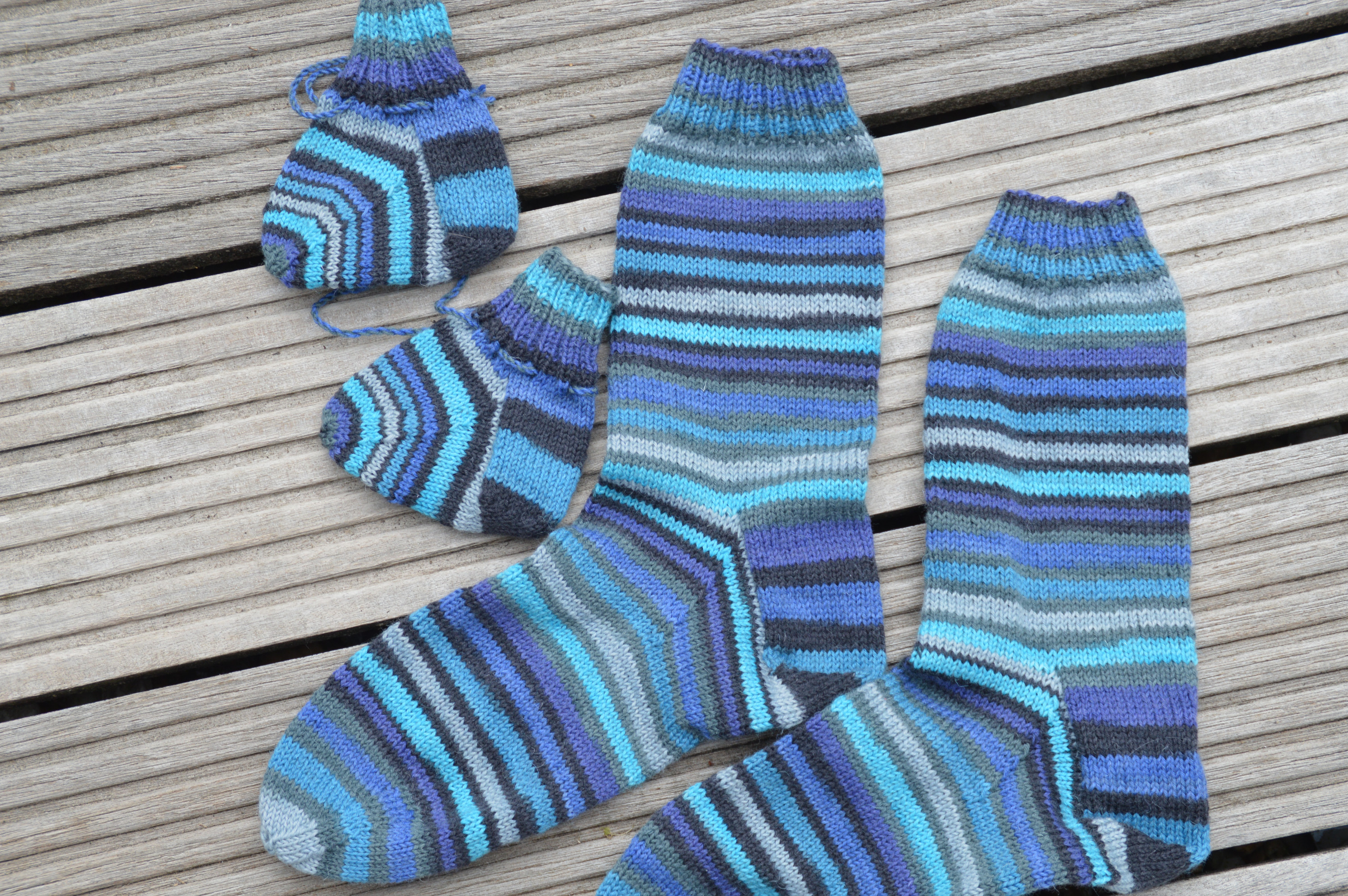 Vater & Sohn Socken aus Garn von Lana Grossa, Landlust Sockenwolle, 4-fädig. Die Vatersocken (Gr 43) sind mit Nadelspiel 3, die Babysöckchen mit 2,5 gestrickt. Das Garn fühlt sich prima weich an und zeigt ein schön klares Maschenbild.