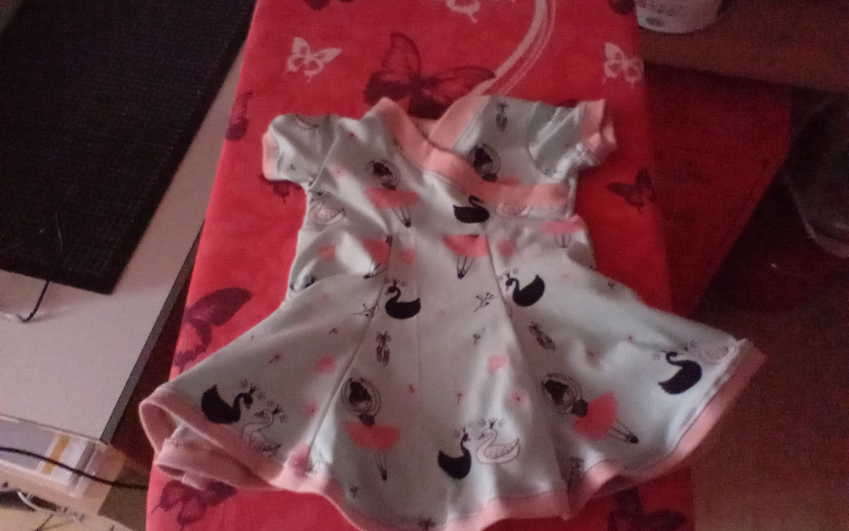 Das war nicht mal beabsichtigt. Ich habe so zugeschnitten, wie die Schnittmusterteile im Maschenlauf auf den Stoff passten. Ich habe nur versucht, unten auf den Rockteil eine Prinzessin und ein Paar Schwäne zu plazieren.