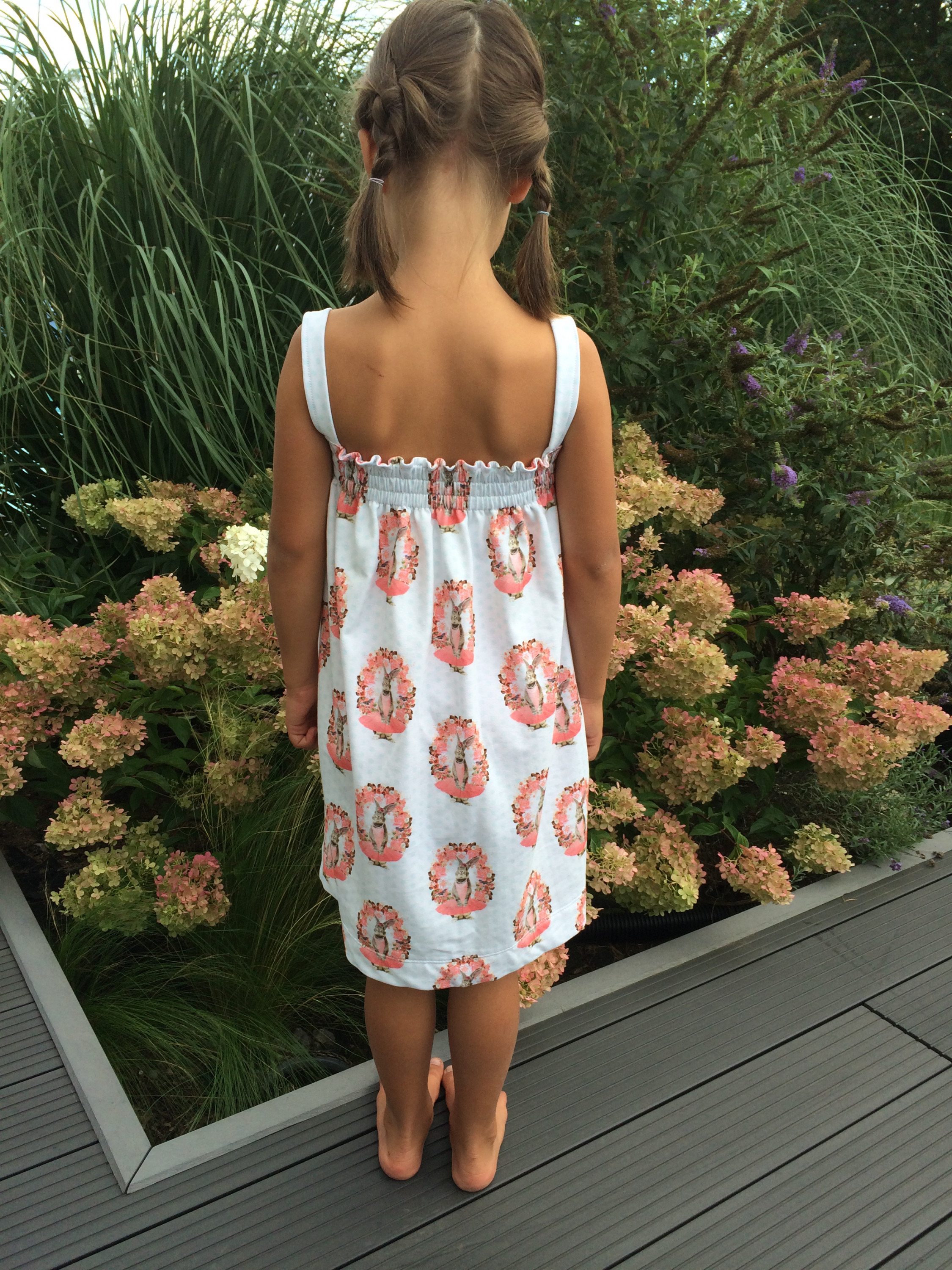 Nach Schnitt, geändert habe ich während dem Nähen nur die Anzahl der eingezogenen Gummis. Da sollen bei der Größe 8 Stück rein.... wo? frag ich mich ..... geworden sind es 3 und das passt perfekt. Und den Hasen kann man auch noch gut erkennen.