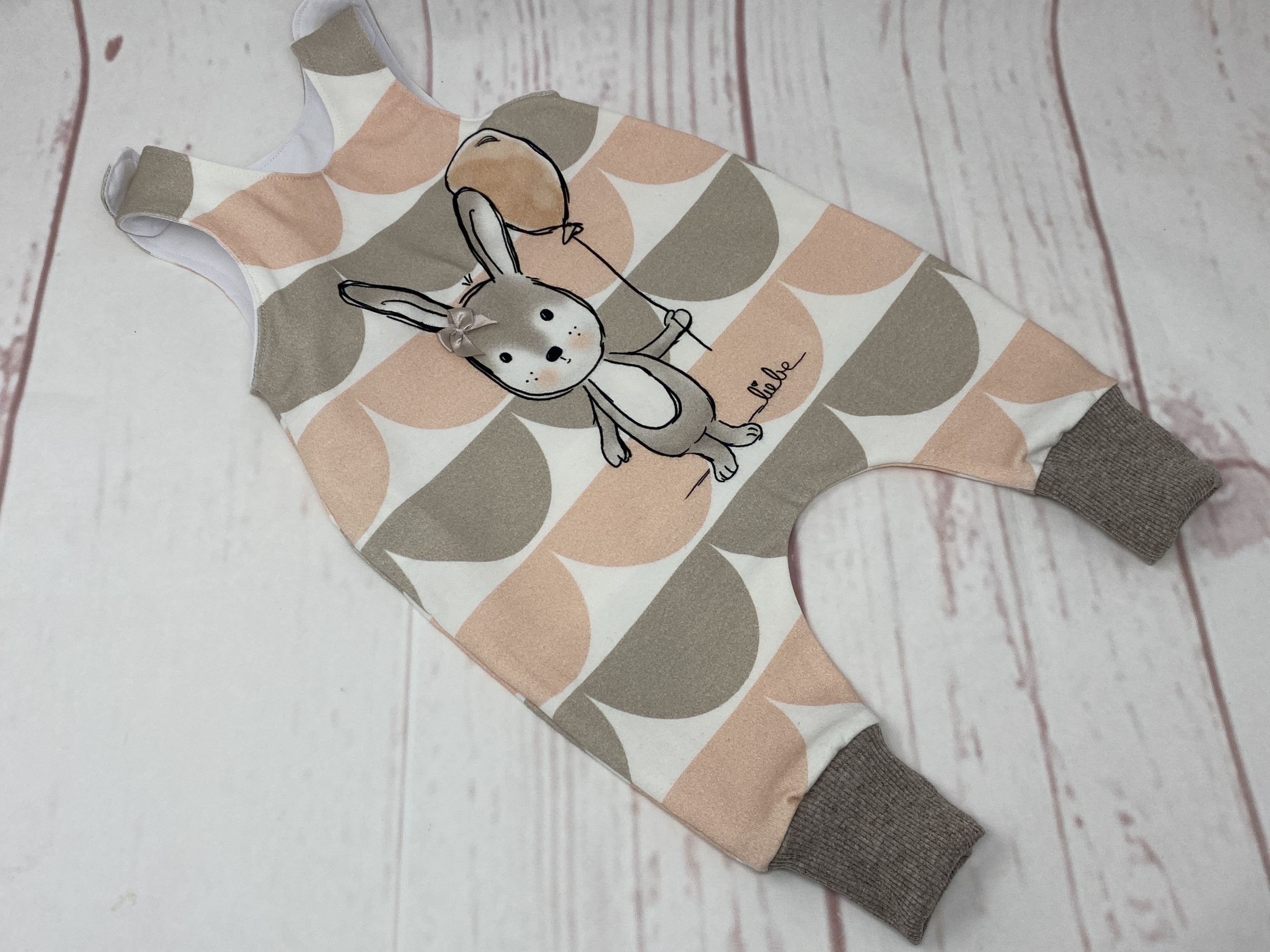 hier kommt er nun: der Strampler mit dem Hasen in aprikot
