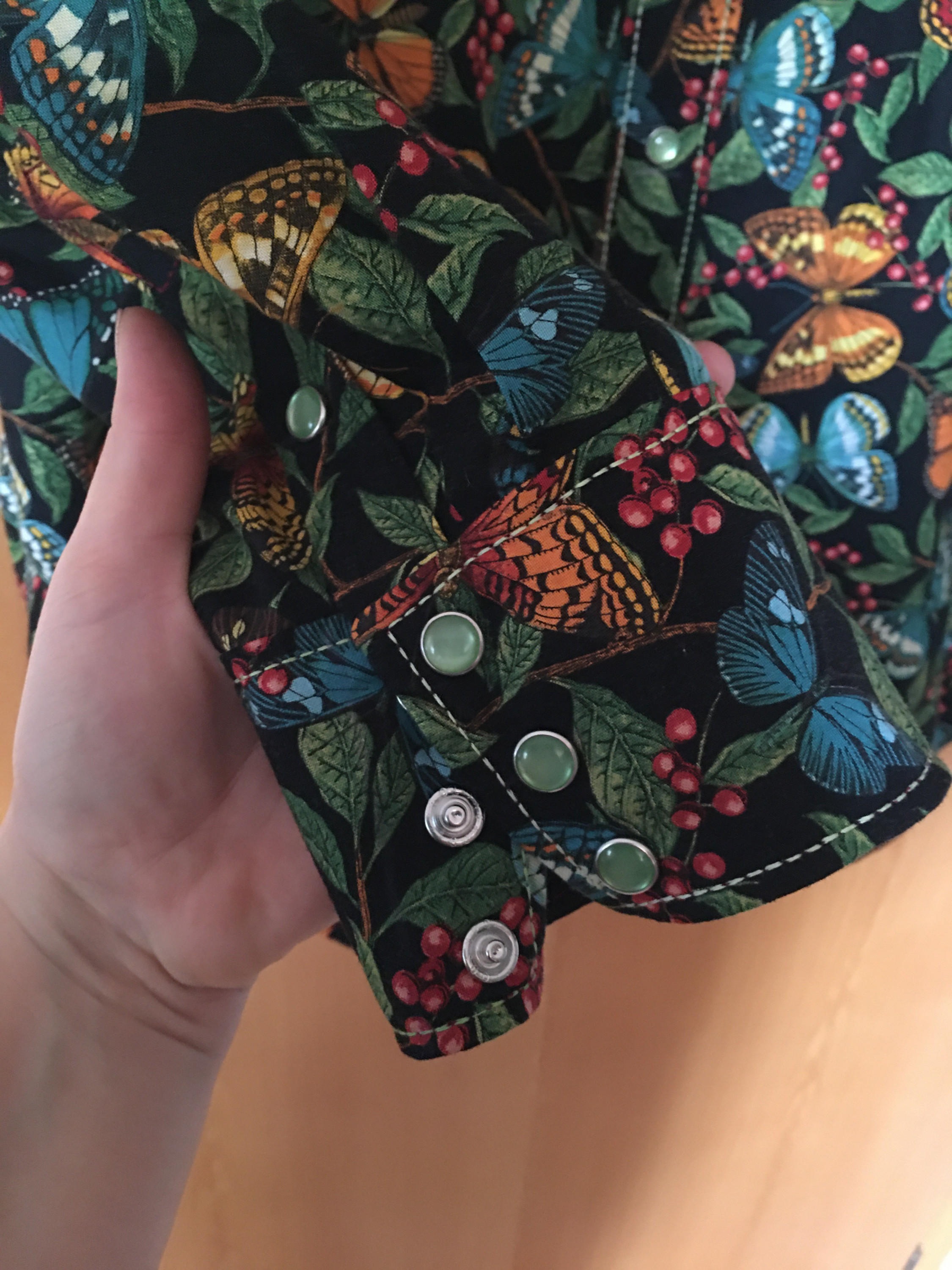 mal wieder ein Hemd für meinen Mann. Im Westernstiel mit geschwungenen Jokes und Druckknöpfen. Stoff ist von Timeless Treaures, die Schmetterlinge vom Stoffmarkt. Steppnähte mit Aurifil Baumwollgarn. Kragenband und Manschetten sind innen auch schwarz gehalten.