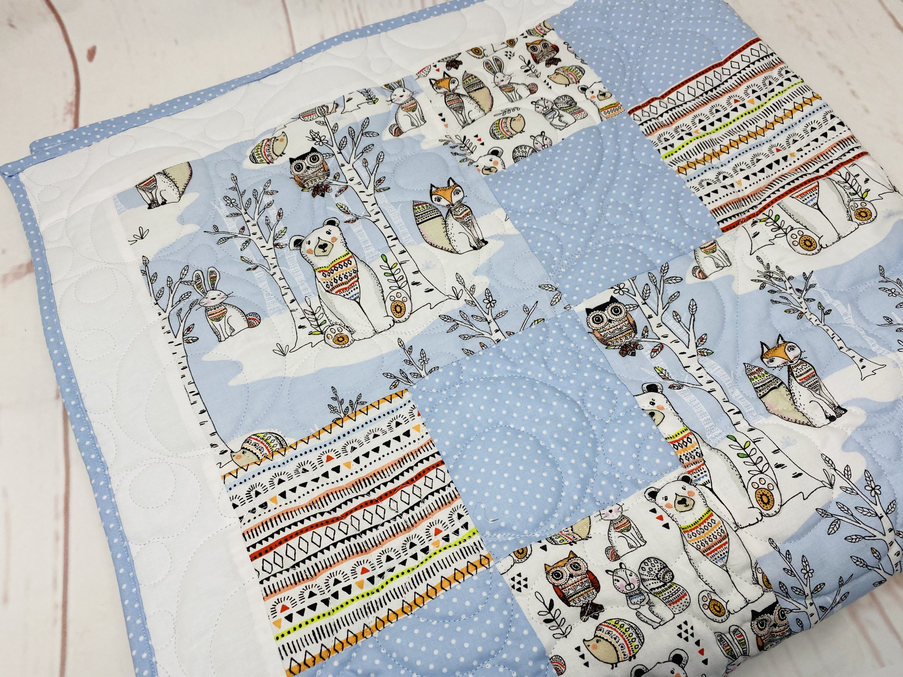 Er ist ca 100x100cm groß, Oberseite aus einfachem Muster, mit 281 Vlies von Freudenberg wattiert und hinten mit hellblauem Minky mit Punkteprägung.