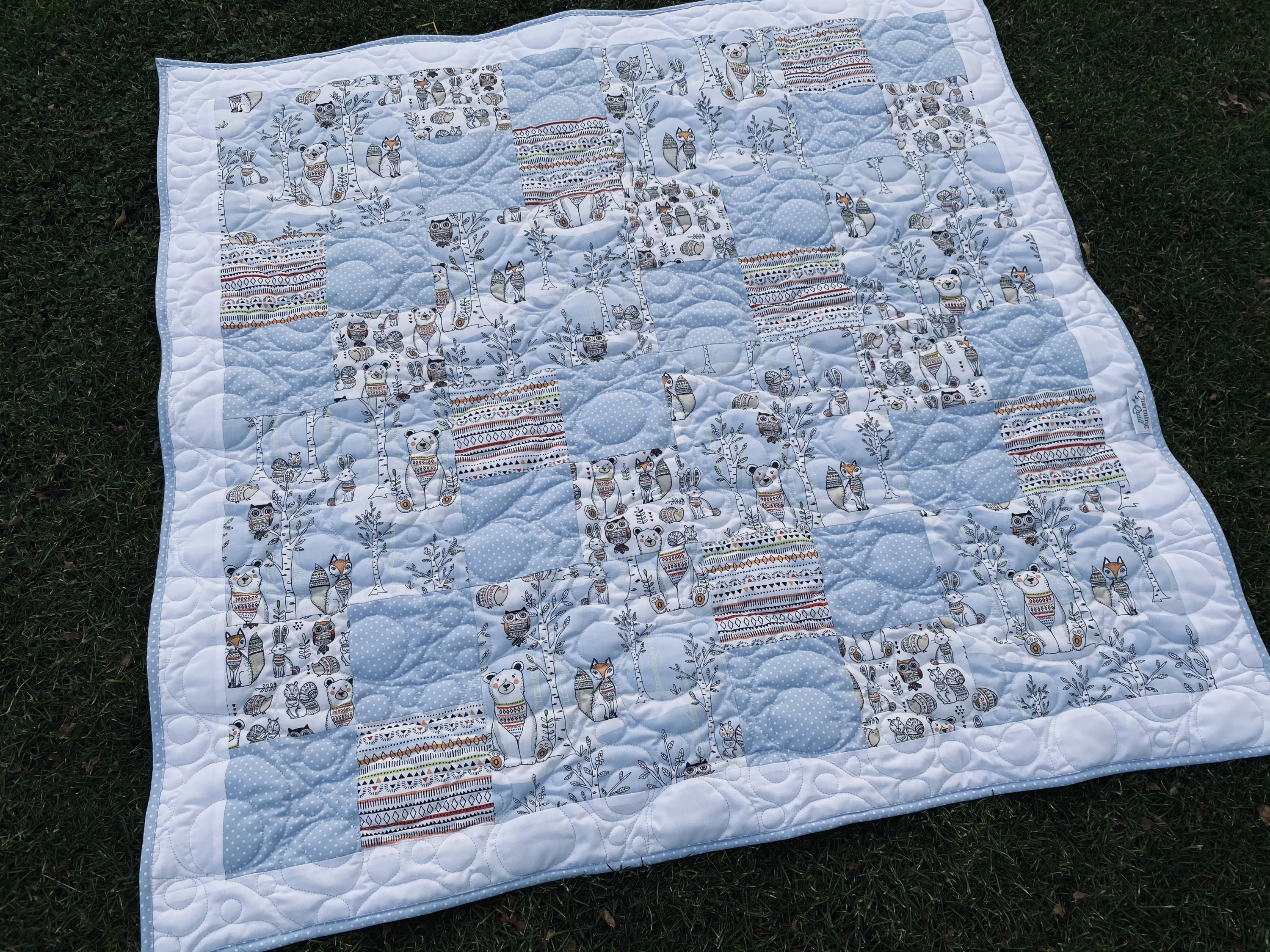 Er ist ca 100x100cm groß, Oberseite aus einfachem Muster, mit 281 Vlies von Freudenberg wattiert und hinten mit hellblauem Minky mit Punkteprägung.