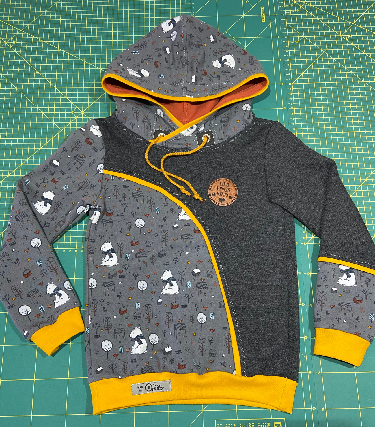 Schnittmuster „Hoodieglück“ von der Stoffmetropole in Größe 122 mit Teilungen und Paspeln. Für den ersten Versuch schon ganz gut gelungen.