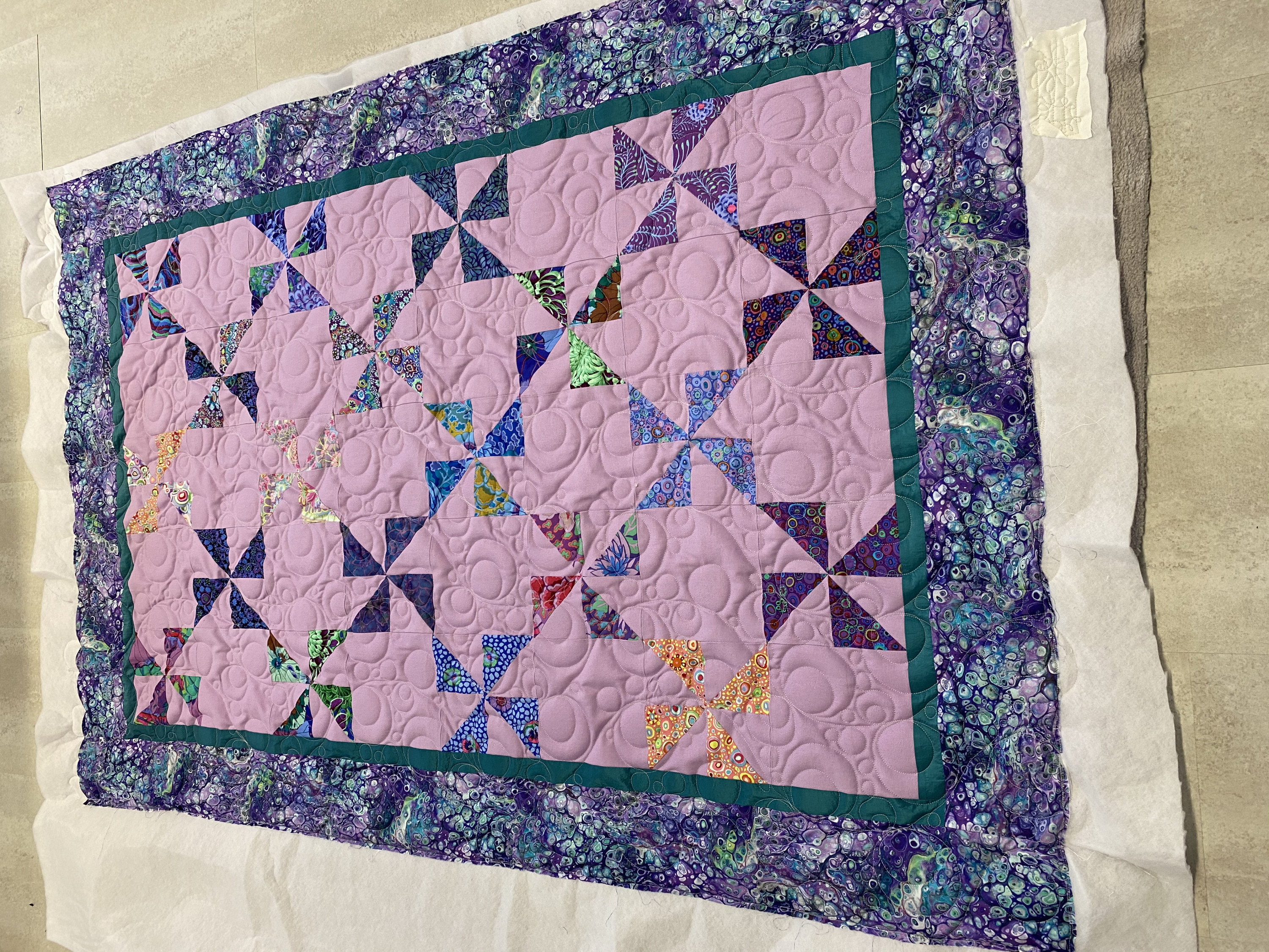 also - hier endlich fertig. Der Pinwheel Quilt meiner Kundin, gequiltet mit Kreisen als Panto.