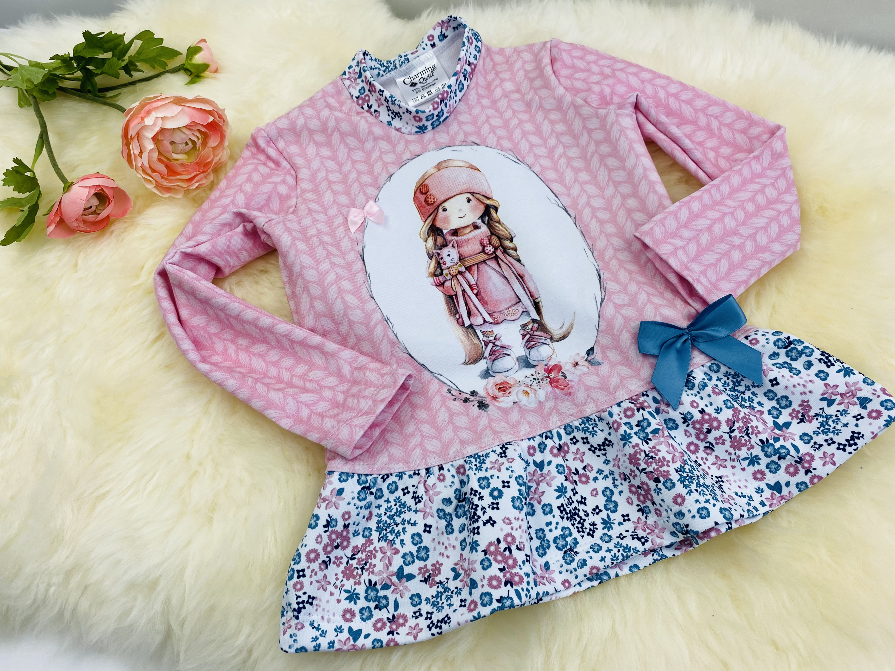hier kommt das nächste fertige Projekt: das süße Panel vernäht zu einem Rüschenshirt in Gröe 92. Schnitt von mir. Kombiniert mit den kleinen Streublümchen und Schleifen dürfen natürlich nicht fehlen.