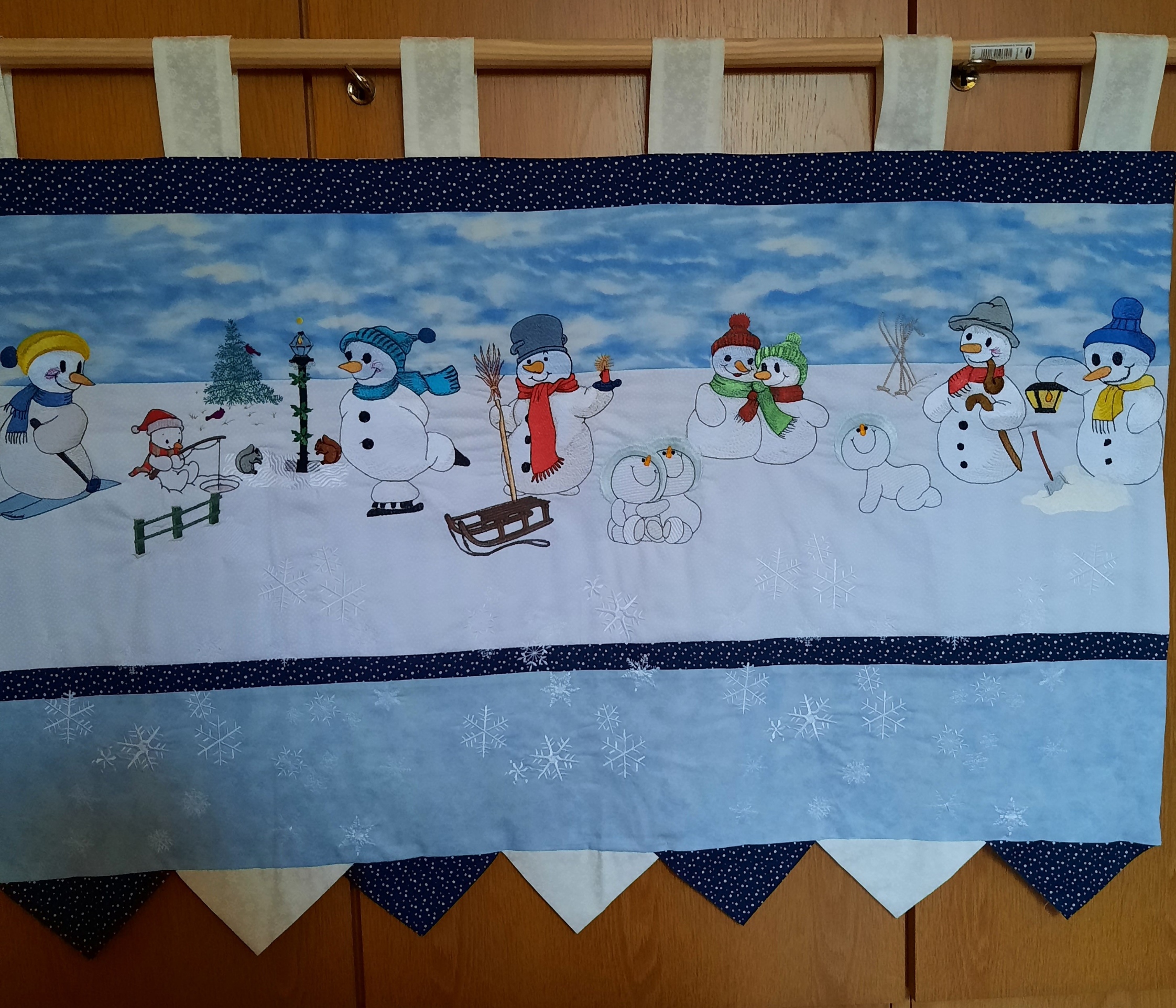 Endlich ist er fertig! Der Wandbehang mit den schönen Schneemännern und ganz vielen Schneeflocken.
