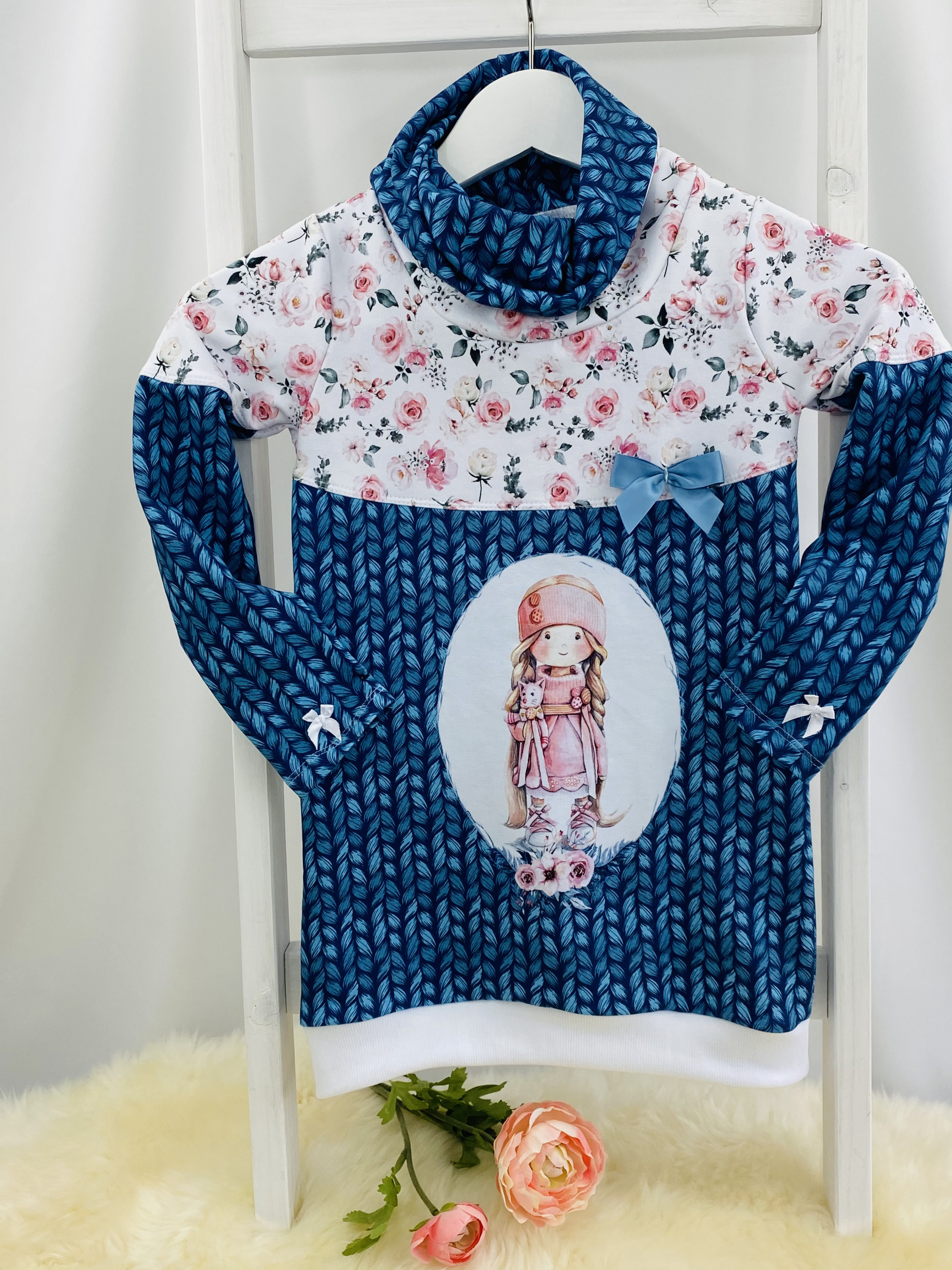 Kombiniert das blaue Panel mit dem süßen Mädchen, dazu der Kombistoff mit den Rosen und ein paar Schleifen. Mehr braucht der Schnitt wirklich nicht.