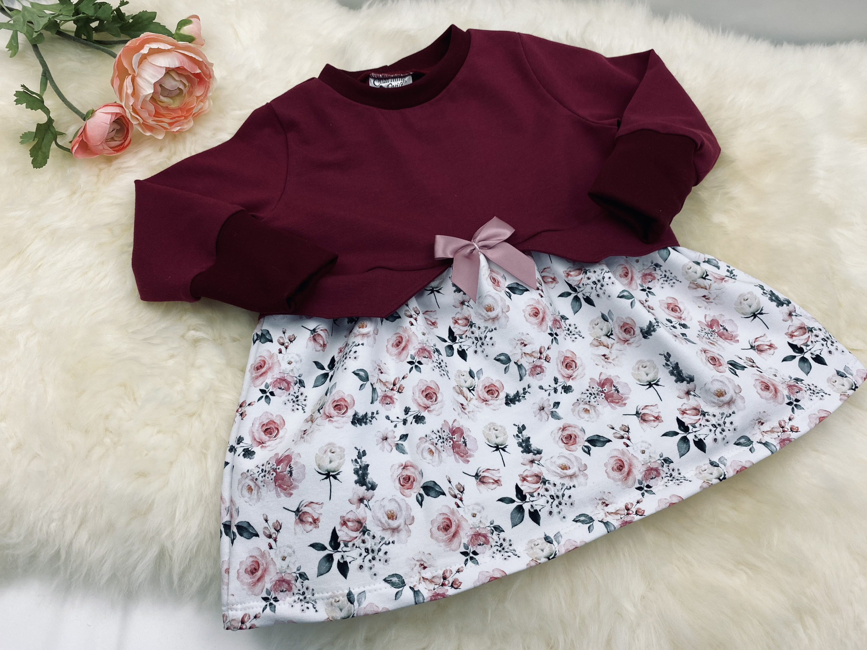 Rockteil gerafft mit Framilon, Oberteil weinrot uni aus dem Vorrat und der Rosenstoff ist der Rest aus der Panel-Vernähung. Nur noch ein Schnipsel übrig.