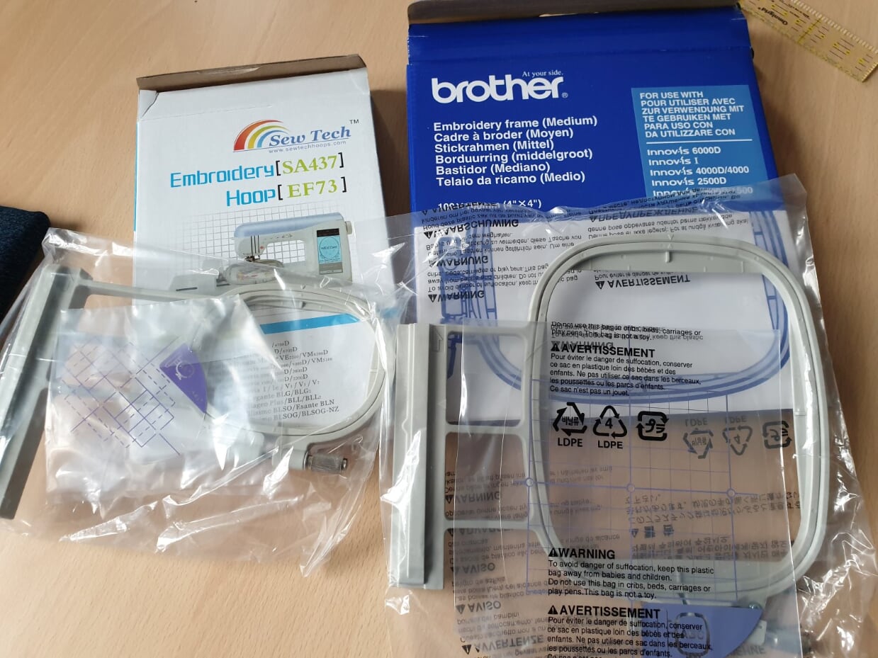 Der linke kleine Rahmen ist der "generische" mit der feststehenden Schraube - rechts der Oroginal-Brother-Rahmen.