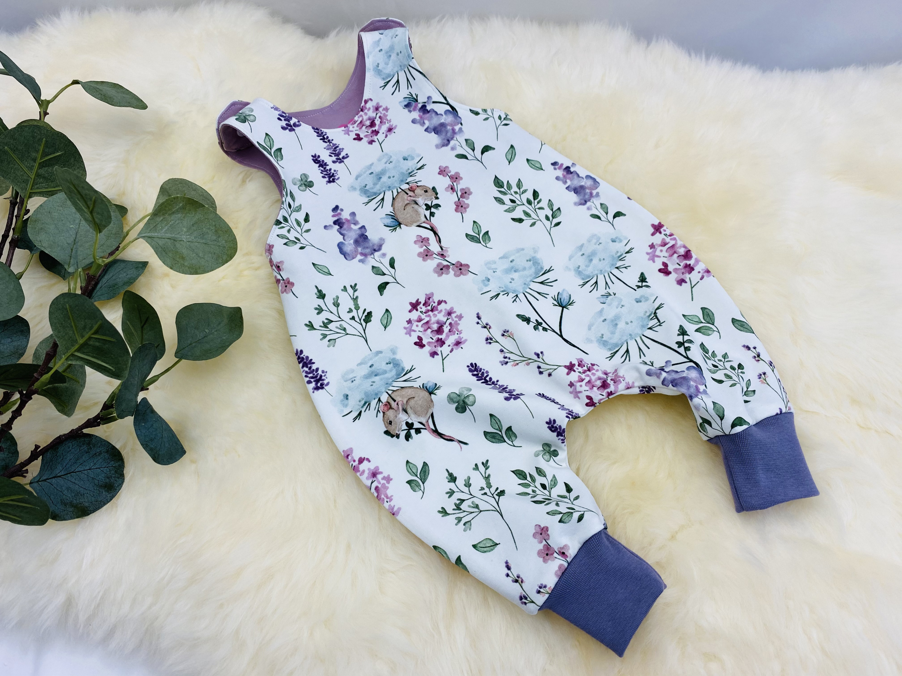 Genäht habe ich ihn in Größe 62, die Belege sind aus einem schönen altrosa, die Bündchen in flieder. Beide Farben kommen im Stoff vor. Ich habe auf die Teilungen verzichtet, so kommt das Mäuschen richtig zur Geltung ![]()