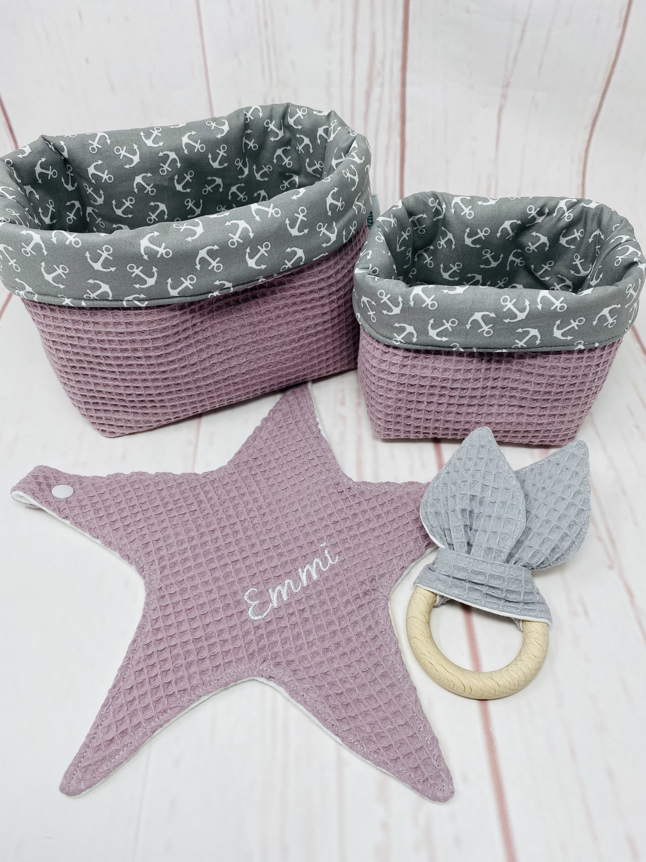 heute durfte ich ein Geschenkset zur Geburt nähen für die kleine Emmi. Ich hoffe, sie kommt bald gesund an.