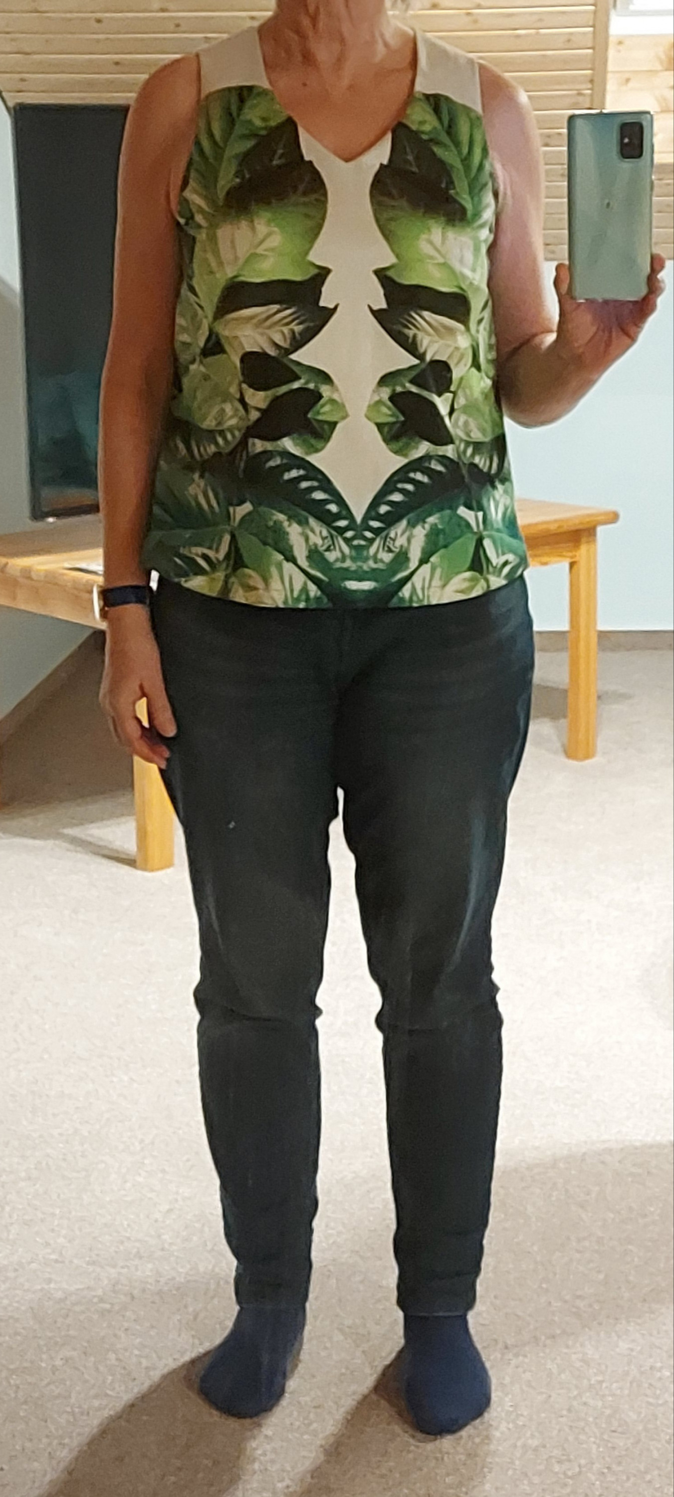 Gr 38, an den Schultern 3cm Länge (oder sagt man Höhe?) dazugegeben und abgeschrägt. Beim nächsten Mal ? nähe ich Gr 40 und gebe wieder 3 cm Länge dazu.