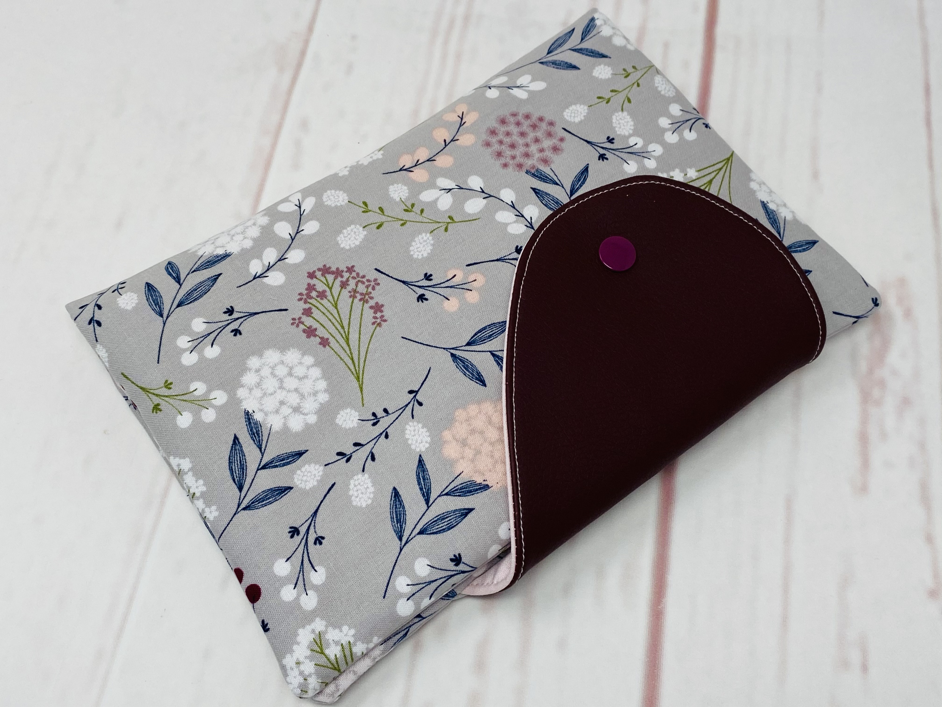 Stoffe hat sie sich die Blüten Baumwolle ausgesucht. Gut abgelagert, war ein Mitbring-Schätzchen aus den USA. Und spontan dazu das Kunstleder in weinrot für den Verschluss. Sieht edel aus und das Industriemaschinchen hats genäht wie Butter.