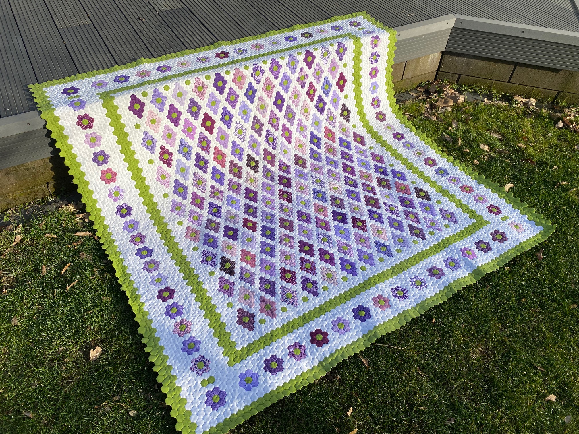 Ich werde aus allen lila Stoffen bunt mixen und muss nun erstmal heften. Dann kann ich weiter nähen. Ich denke, ich werde über den Sommer einfach komplett heften, was das Zeug hält und dann im Herbst, wenn es wieder kühler wird, an den großen Quilt annähen.