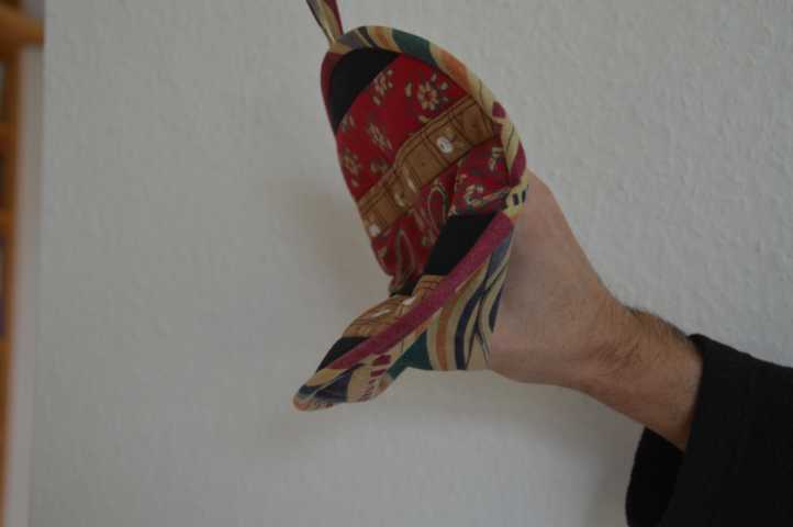Topflappen zum Testen, Duchmesser 22 cm: quilt as you go auf der Vorderseite aus Resten, 2 Lagen Thermolam und einer Lage altem Vorhangstoff; Rückseite ebenfalls aus altem Vorhangstoff, aus zwei Teilen. Da kann man reingreifen und zupacken. Genäht nach einer Youtoube-Anleitung.