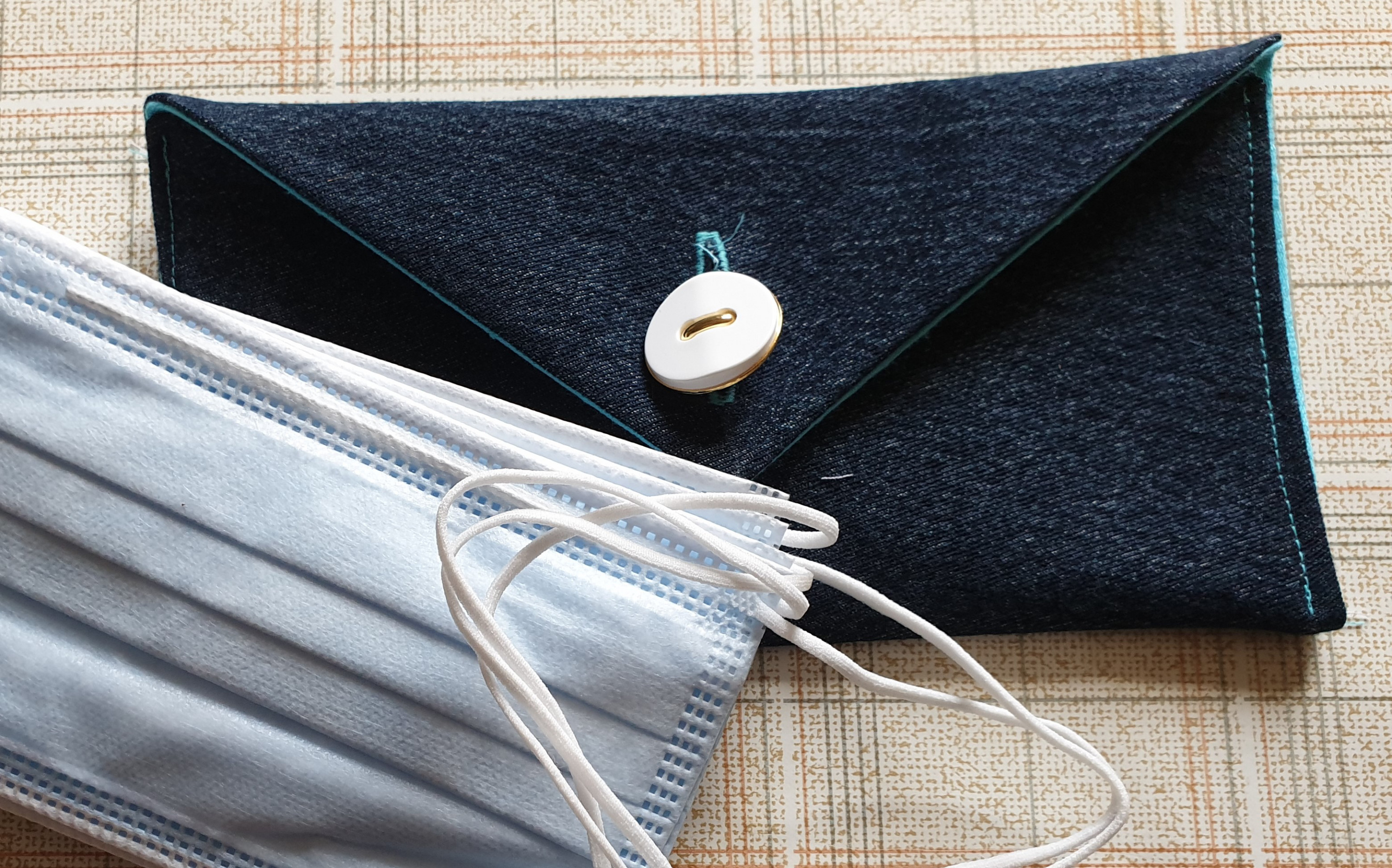 Nachdem ich für meine Schwester Maskentaschen genäht habe, fiel mir ein, dass so eine sich auch im Handschuhfach meines Autos gut machen würde. In diesem Falle Denim aus Jeans-Recycling, gefüttert mit gefärbtem Bettwäsche-Damast (ich liebe türkis!).