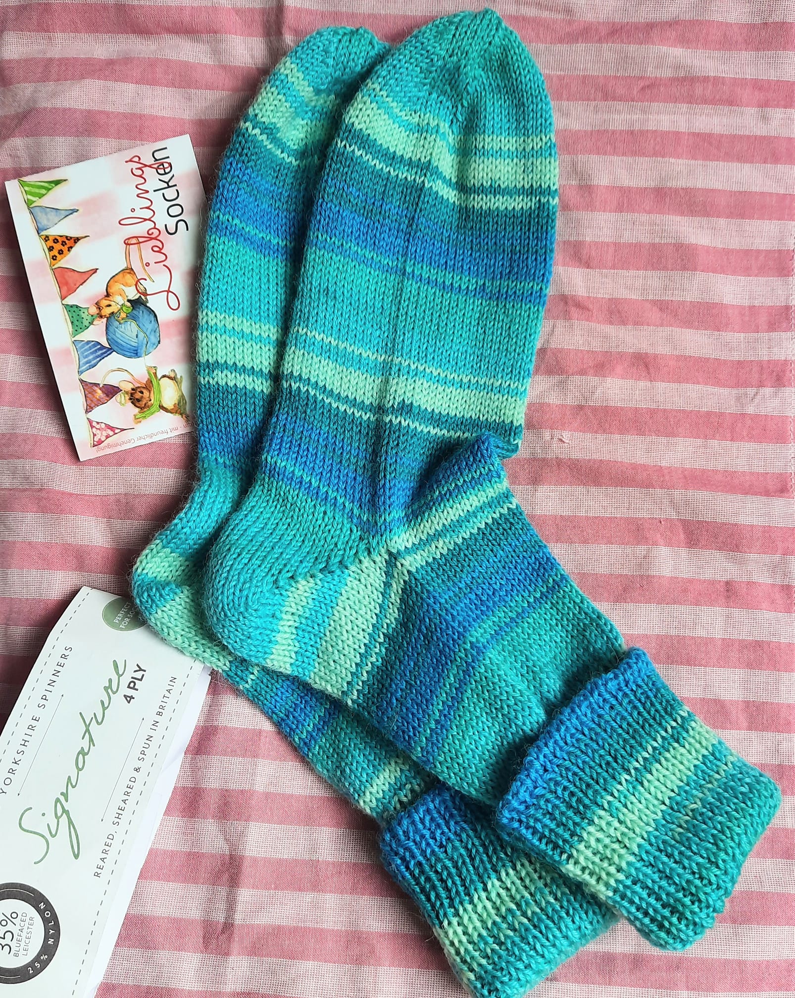 Ein Mädchen des Bauernhofes wo wir wohnen, hatte sich bei unserem Nähnachmittag in diese Farbe meiner Sockenwolle verliebt. Also habe ich ihr davon neue Socken gestrickt. Gestrickt mit meiner Brother Strickmaschine 892 mit Doppelbett. die Wolle ist aus Schottland von den dort heimischen Schafen.