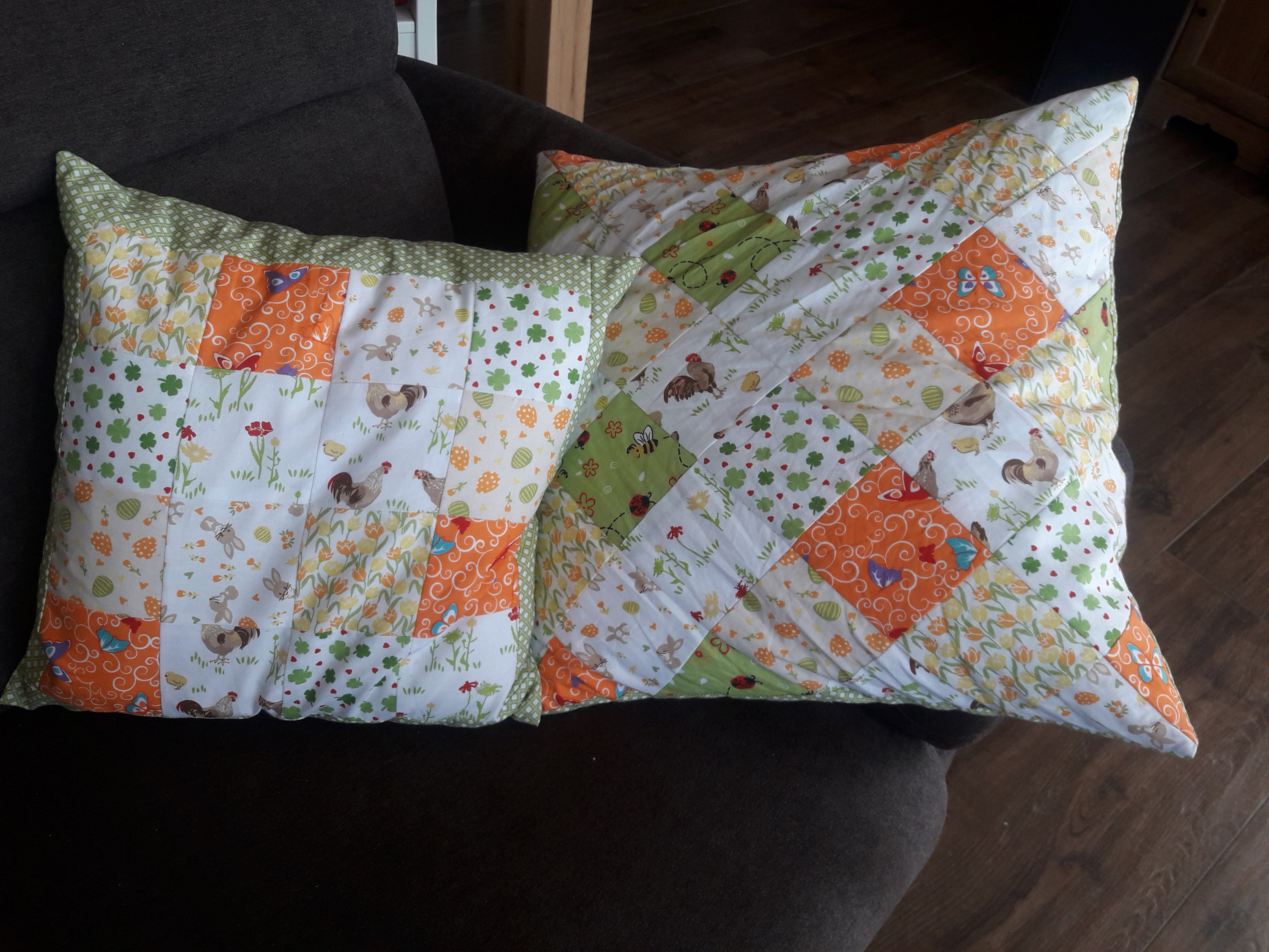 Eins ist 50x50 cm groß, das kleinere 40x40 cm. Die Rückseiten bestehen aus dem grüngemusterten Stoff wie der Rand beim kleinen Kissen. Verschlossen werden die Kissen wieder mit Kam Snaps