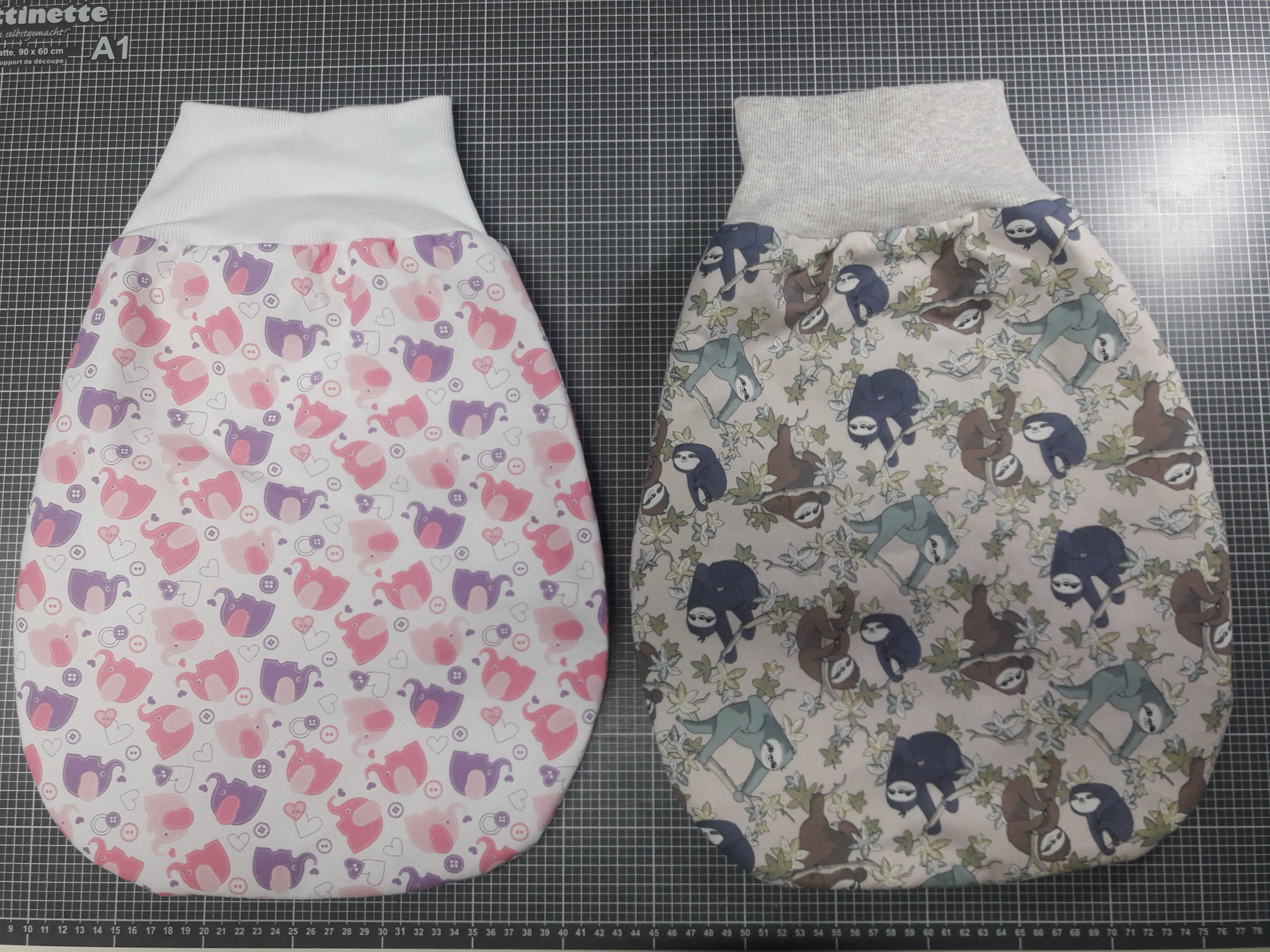 Für unser jüngstes Familienmitglied habe ich zwei Strampelsäcke genäht. Der Schnitt ist von Kullaloo, Oberstoff ist Baumwollwebware, gefüttert sind sie mit weißem Jersey, dazwischen ist ein Baumwollvlies.