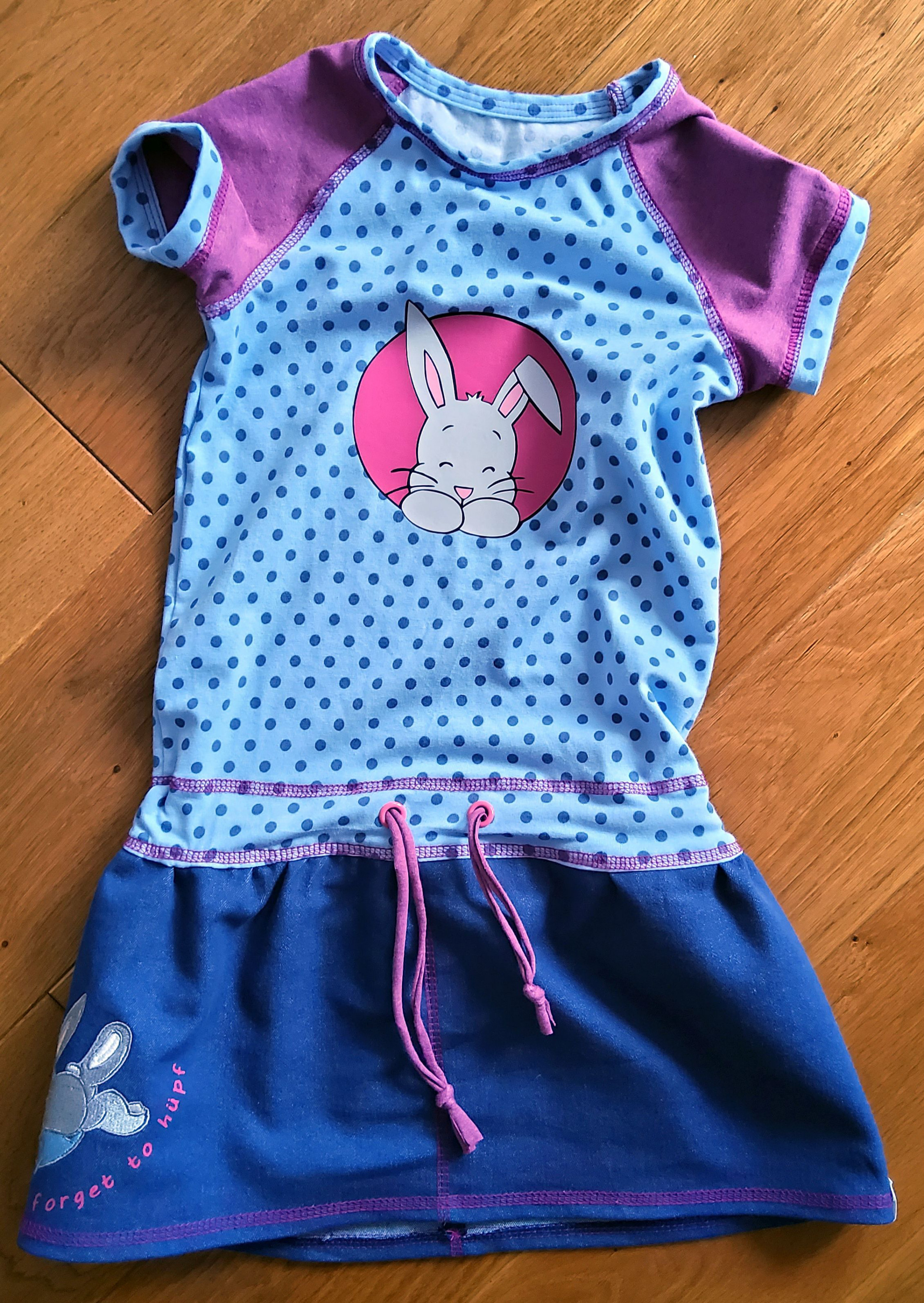 Das diesjährige Osterkleid, nach dem bei Kind und Mama sehr beliebten Schnitt von Klimperklein, habe ich mit einem Plott auf dem Oberteil und einer Stickerei auf dem Rockteil (Seite) verziert.