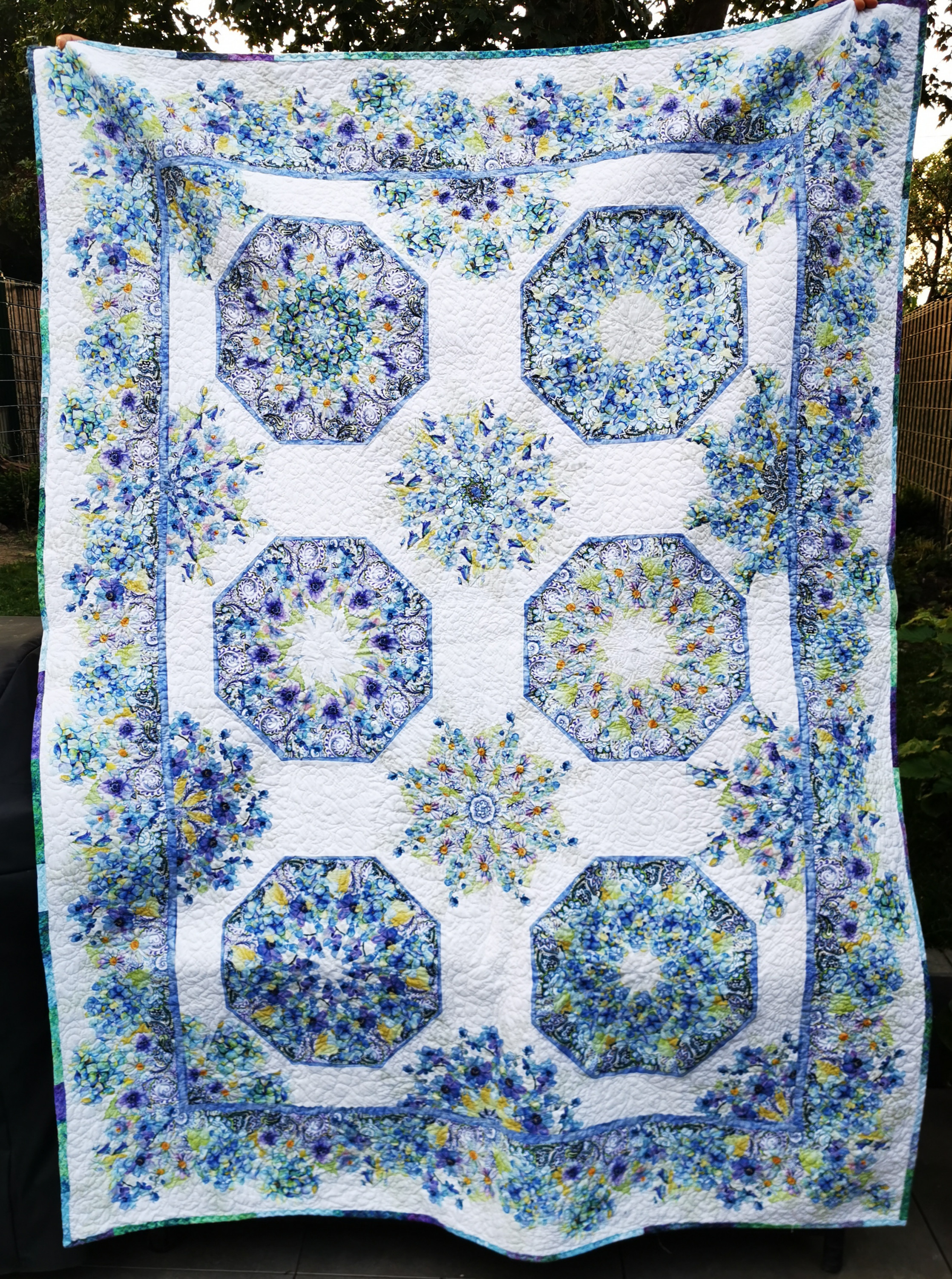 Ich bin irgendwann beim Stöbern in "oneblock wonder quilts" über Jason Yenter Bordürenstoffe gestolpert und auch über seine Anleitungen. Nachdem ich diesen Stoff sah, wußte ich, das der exakt das richtige für meine Nachbarin ist. Leider sind die Stoffe in Deutschland schwer zu bekommen, ich habe diesen in den USA vorbestellt.