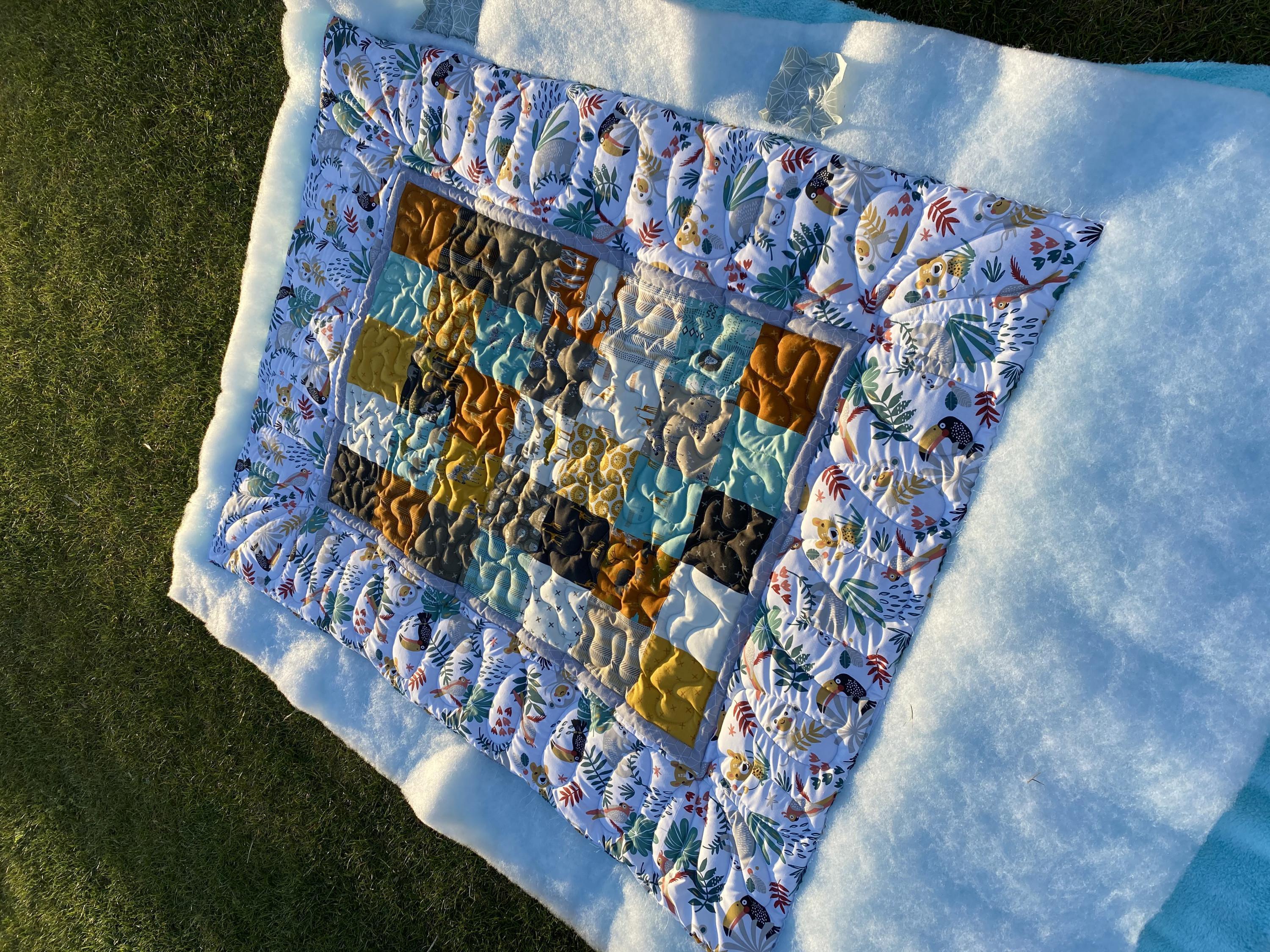 Oberseite: Patchworkstoffe, Wattierung ist P140 von Freudeberg, die Rückseite ein dickes Wellnessfleece von Swafing in türkis, das Binding macht die Kundin selbst, es wird aber einer der Stoffe aus dem Charm Pack werden, den hat sie nämlich beim Bringen des Quiltes schon bei mir gekauft ![]()