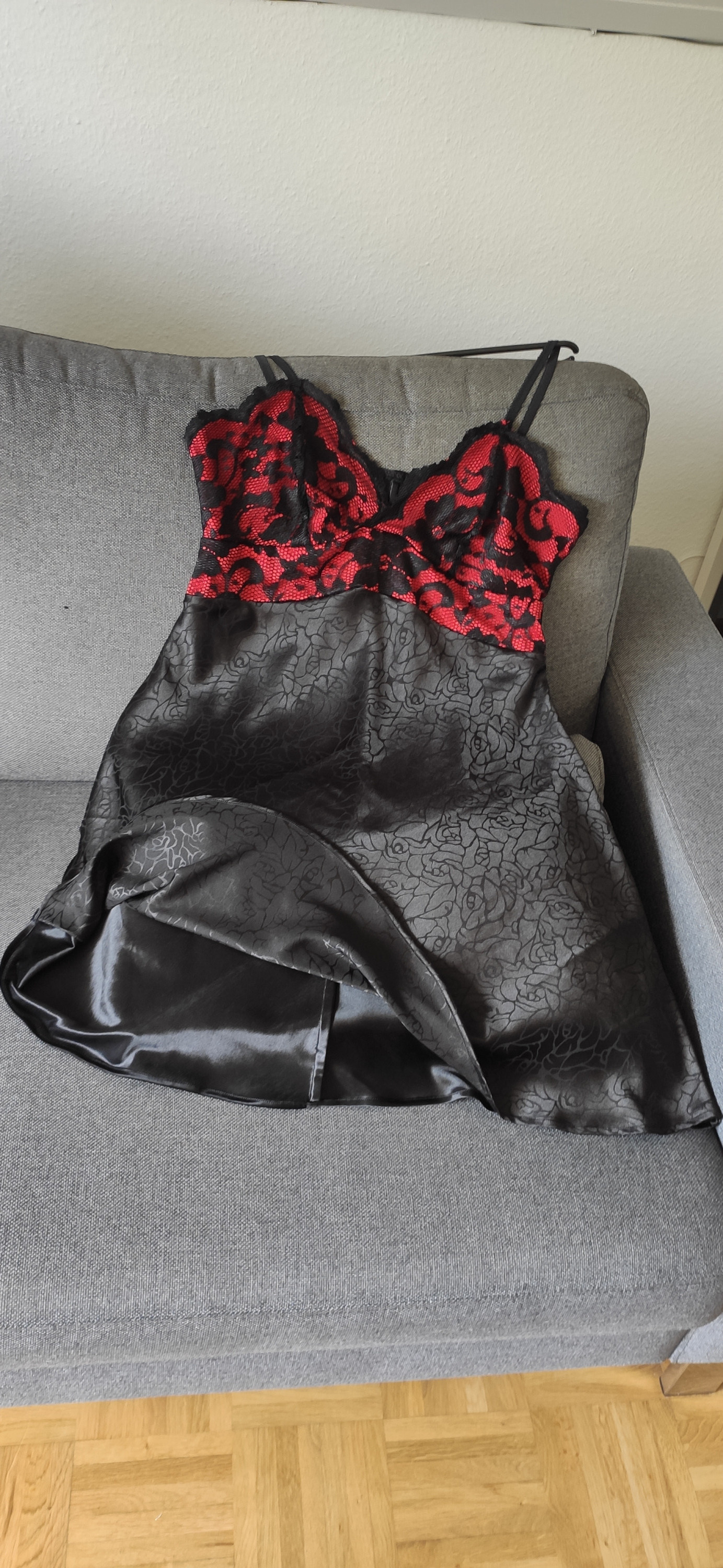 Wirkfutter (rot), elastische Spitze, 2 Sorten Polyestersatin. Genähte Träger durch Wäschegummi ersetzt.