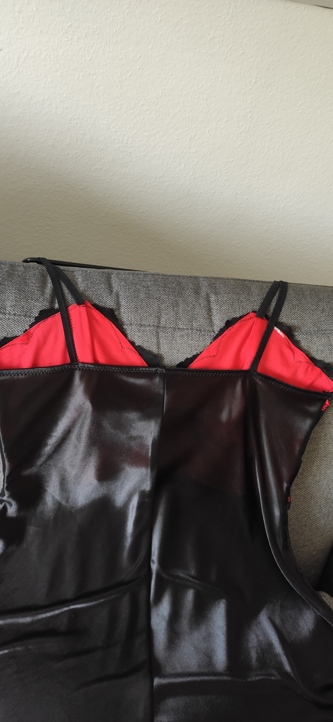 Wirkfutter (rot), elastische Spitze, 2 Sorten Polyestersatin. Genähte Träger durch Wäschegummi ersetzt.