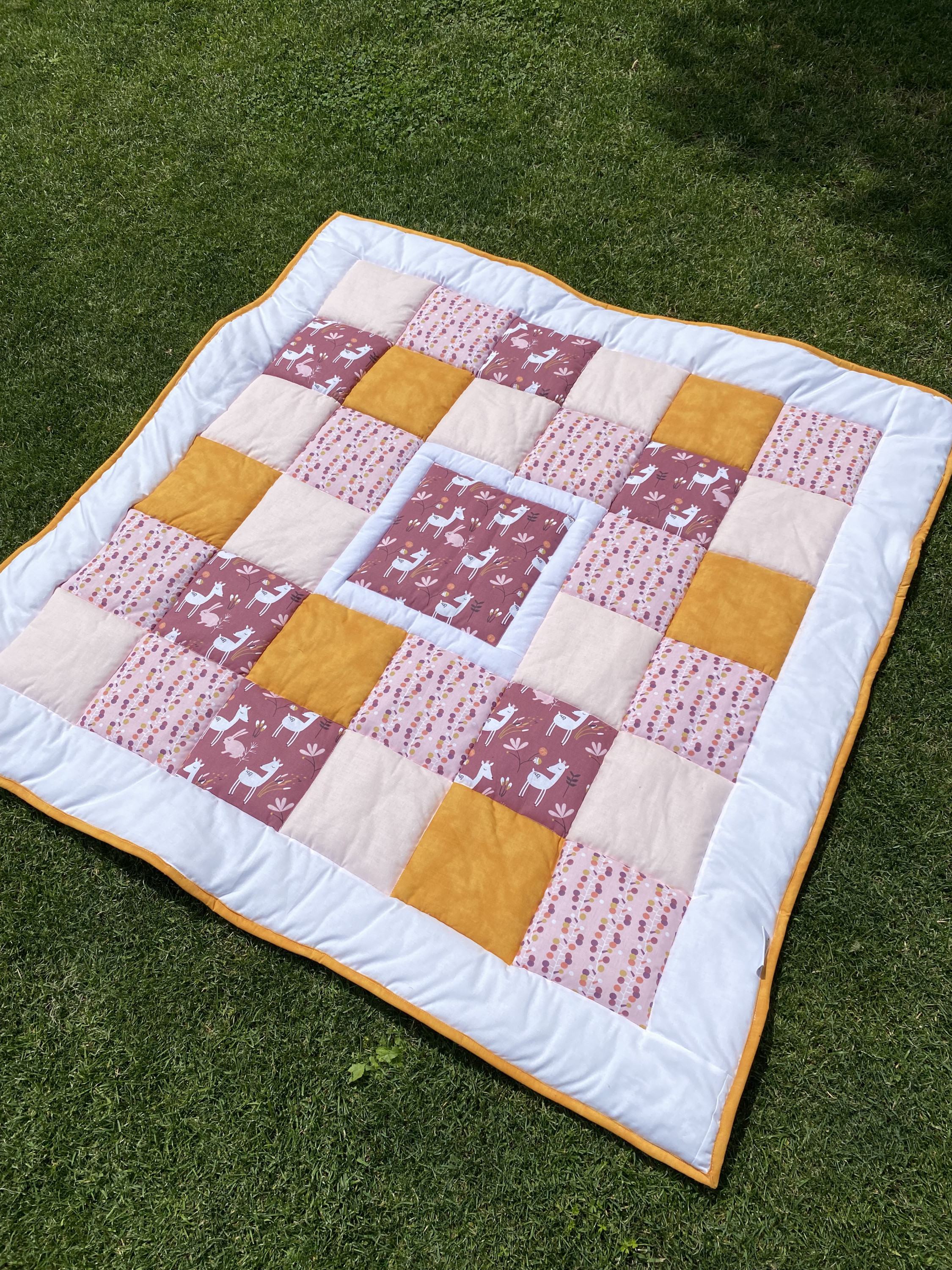 hier ist das fertige Stück: die Oberseite sind reine Baumwollstoffe aus meiner Waldtiere Serie: der Hauptstoff und sein Kombi, dazu uni in gold und rosa. Der äußere Rand war in weiß gewünscht und dazu ein Binding aus gold.