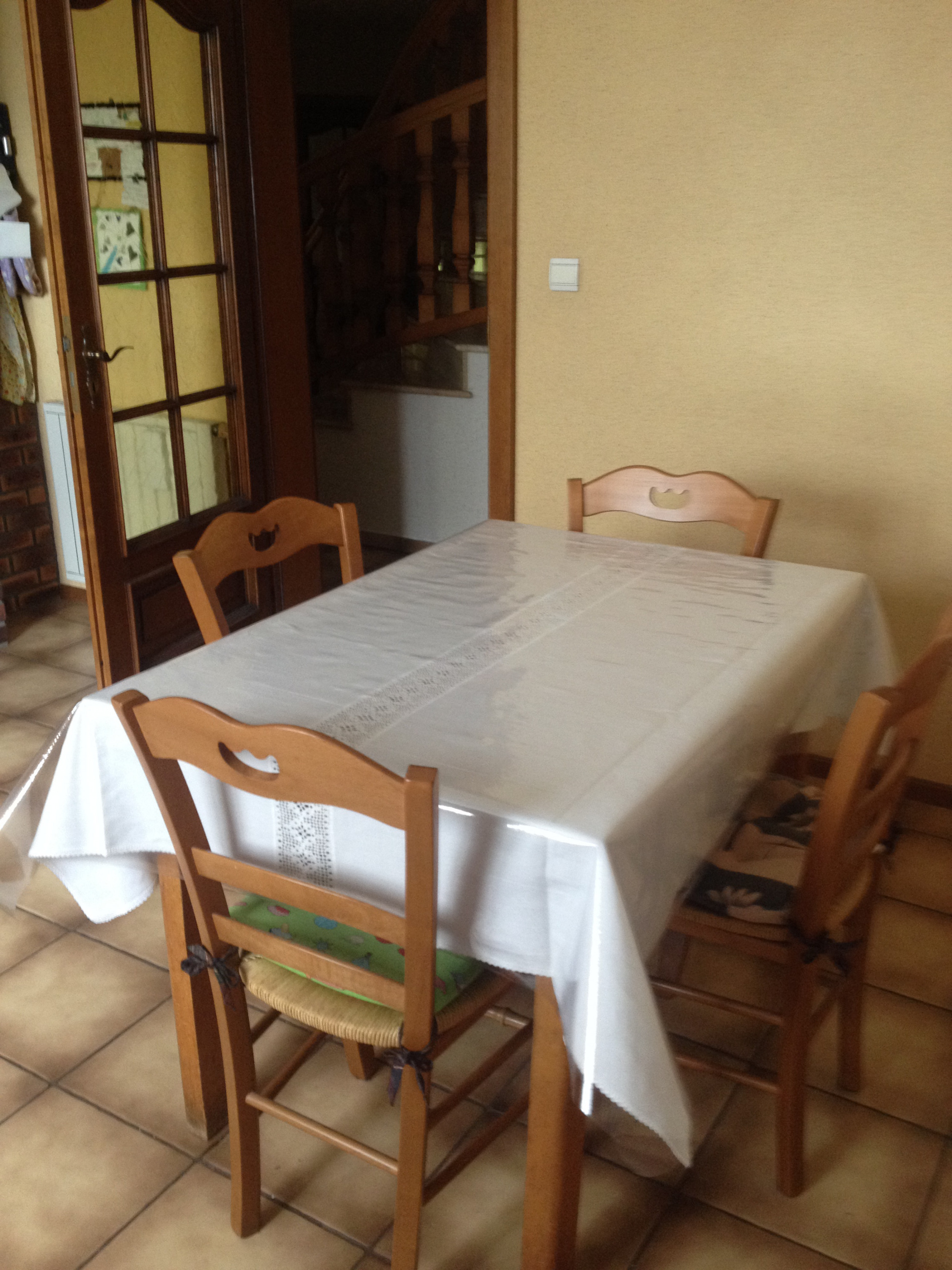 Tischdecke unter durchsichtigem "Wachstuch". Jetzt versifft, verschweinzt, verhunzt und besudelt mir keiner mehr die gute Tischwäsche.