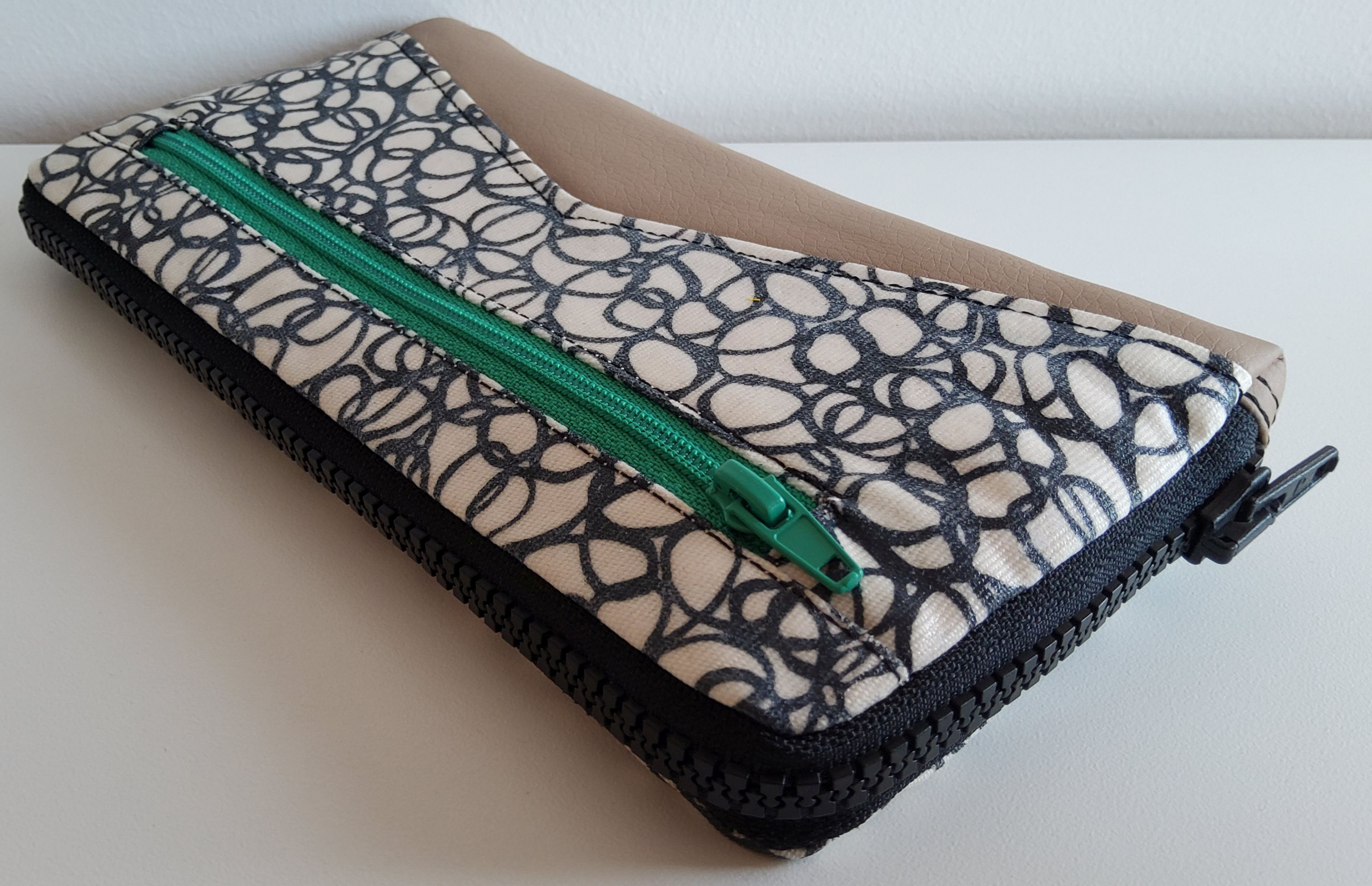 Aus den Optionen habe ich ein großes Münzfach und ein Fach für den Fahrzeugschein ausgewählt. Und zum ersten Mal habe ich ein Fach aus Vinyl genäht. Das hat bestens funktioniert.