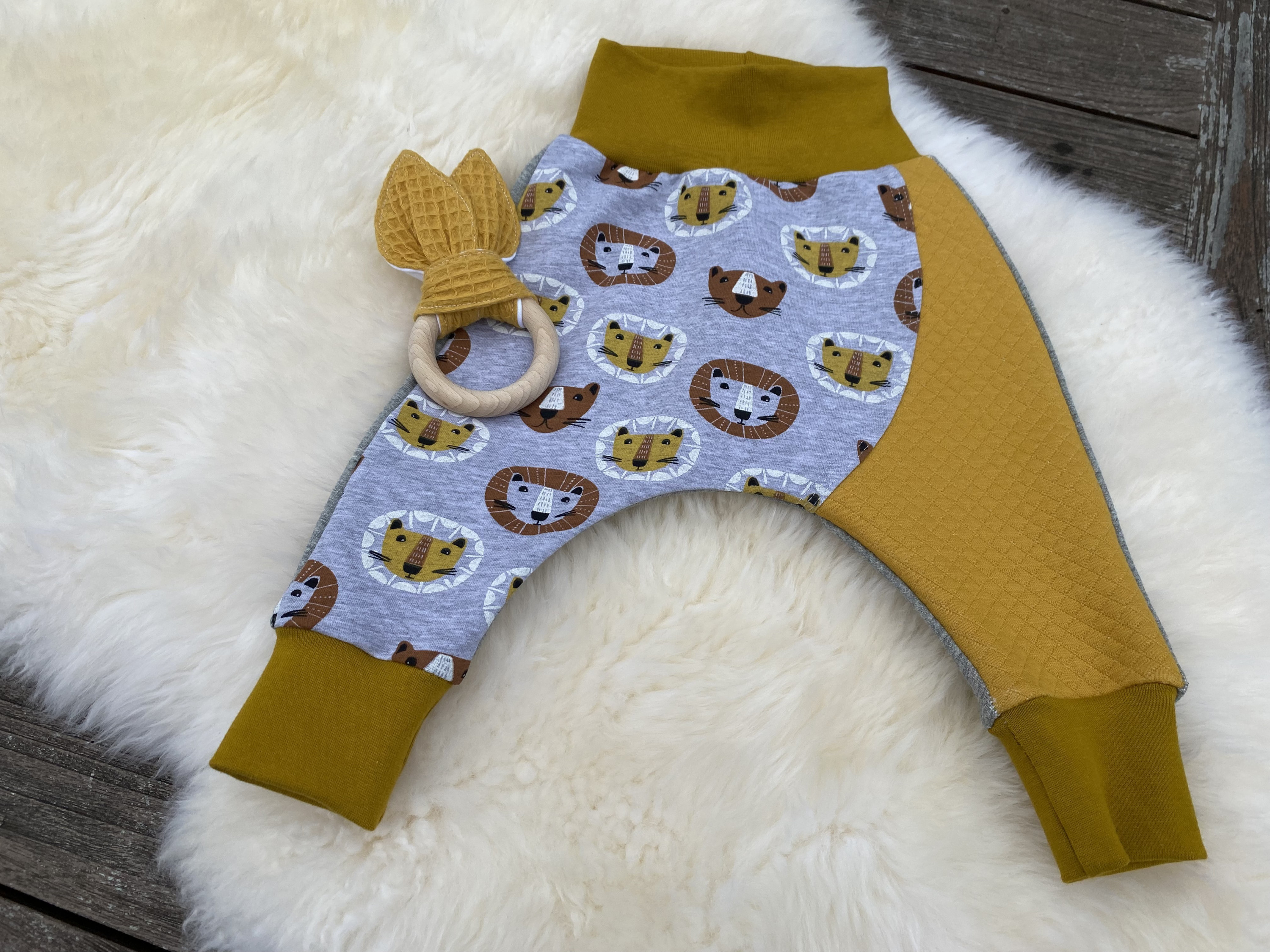 um die neue Maschine einzuweihen, gab es gleich die schon zugeschnittene Babyhose mit den Löwen. Wieder im Muster- und Farbenmix. Ich mag die Kombination ganz gerne - hat Pepp, ist aber nicht zu aufdringlich oder zu wild gemustert.