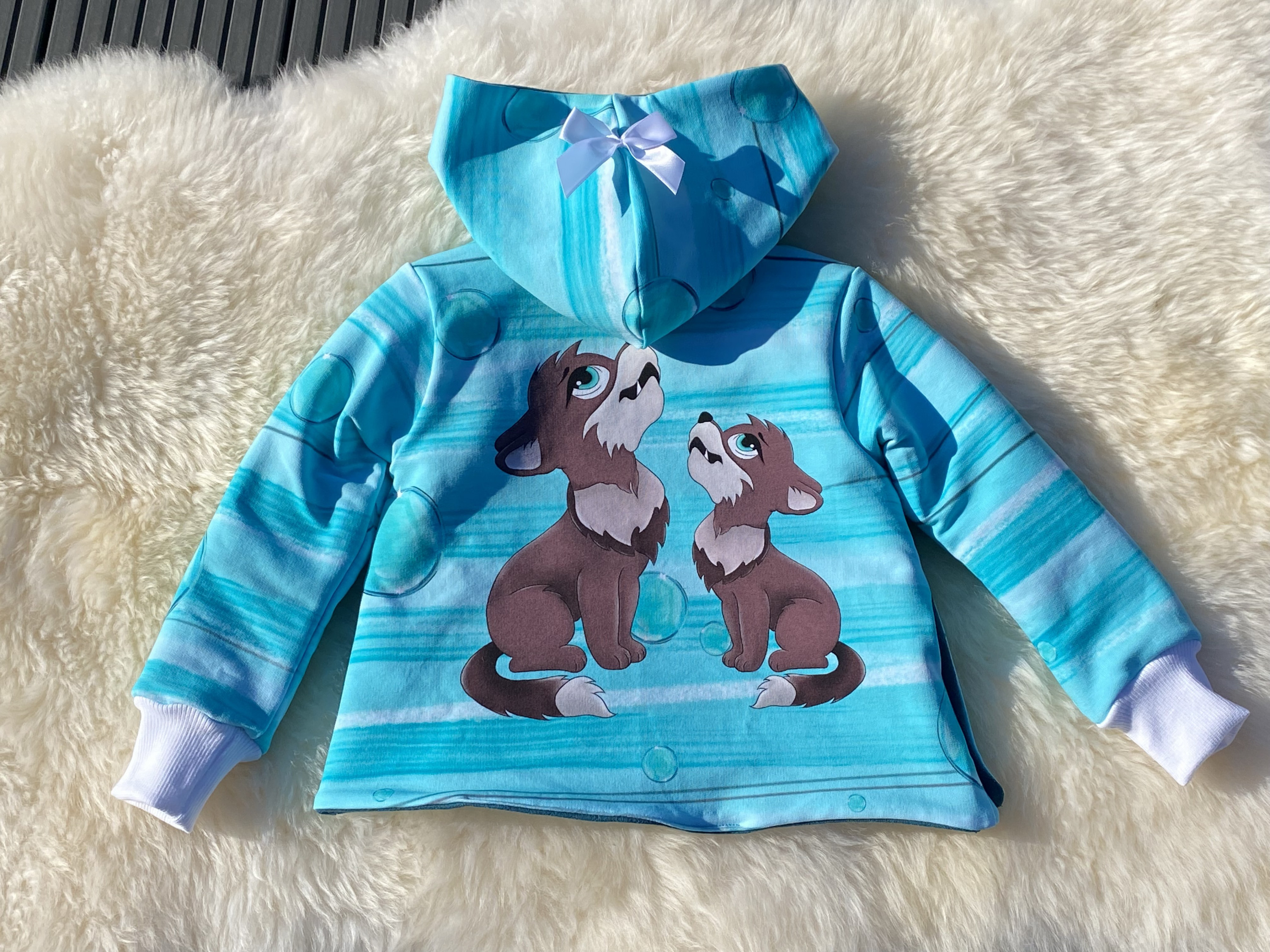 hier kommt also die Jacke aus dem Wolfs Panel. Ich konnte beide Motive unterbringen, das Panel mit der Länge von ca 60cm über die VB hat bis auf den letzten Schnipsel gereicht. Gefüttert ist die Jacke mit einem Waffeljersey in petrol. Ein paar kleine Highlights wie Schleifen, Lederlabel, mein Label und Aufhängeschlaufe.