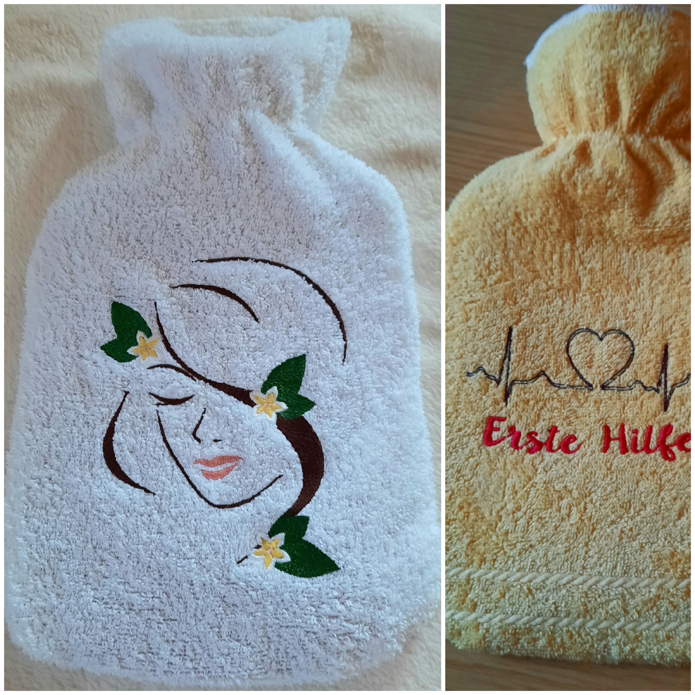 Meine Nachbarin pflegt ihre betagte Mama. Damit die Pflegedinge auch schön aussehen habe ich für die Wärmflaschen Hüllen genäht und schön bestickt. Ein bissel Freude in dieser anstrengenden Tätigkeit.