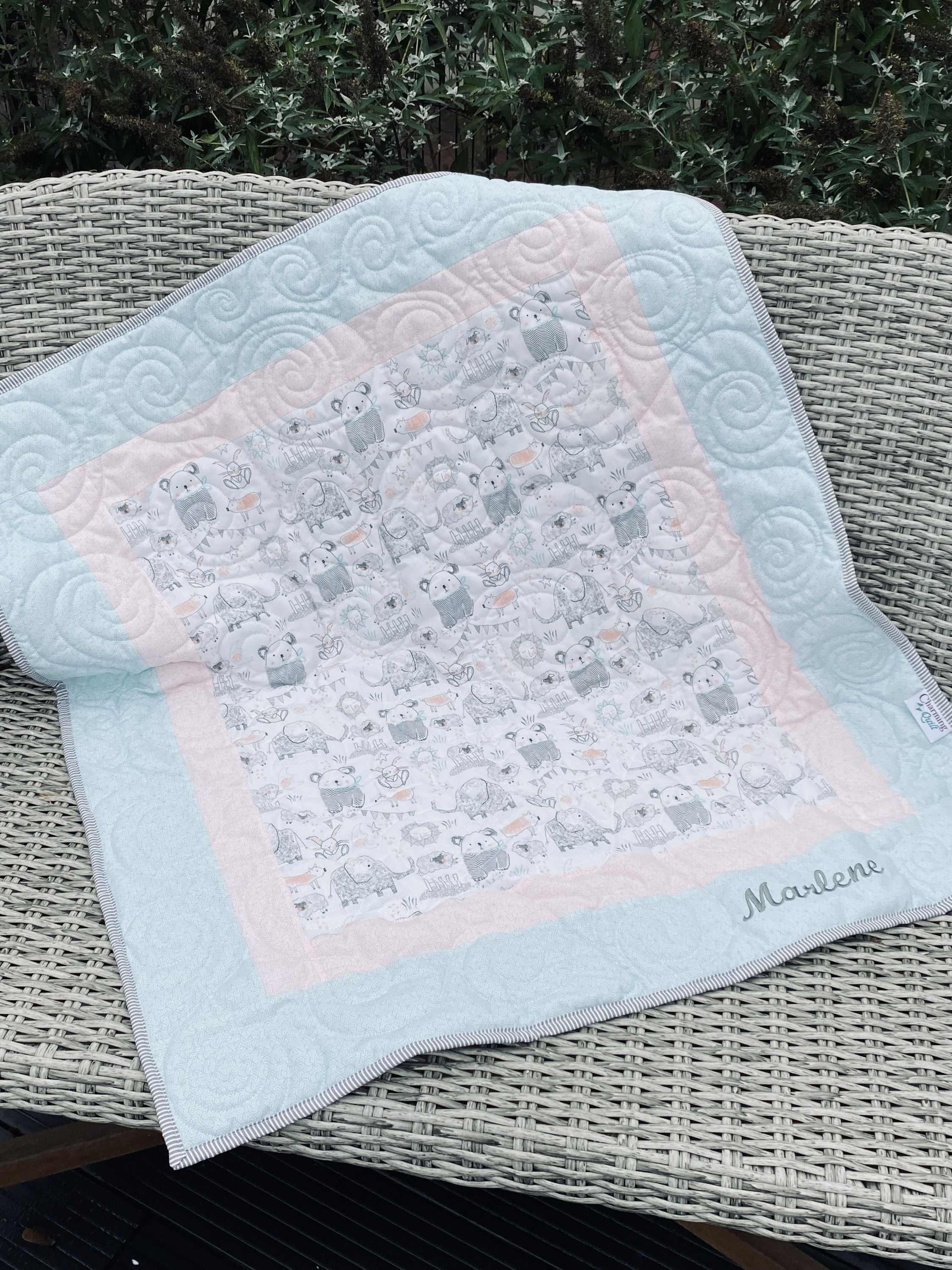 hier kommt der fertige Babyquilt für Marlene - einfache große Swirls wurden auf die pastellfarbenen Kombistoffe gequiltet. Der Name in dunkelgrau passt zum grau-weißen Binding und der hellgrauen Minky Rückseite.