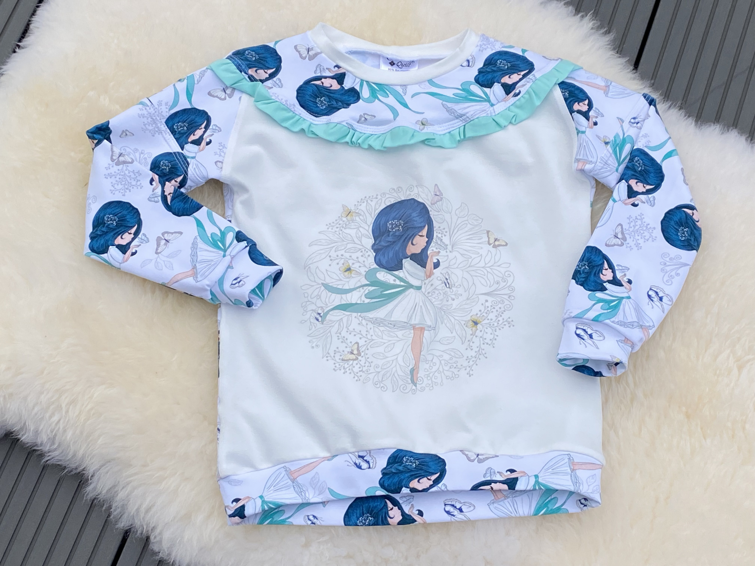 Ich habe den Schnitt mit der Teilung und Rüsche am Vorderteil genäht. Die untere Seite war/ist ein Panel, dazu der Kombistoff. Die elastische Rüsche ist gekauft.