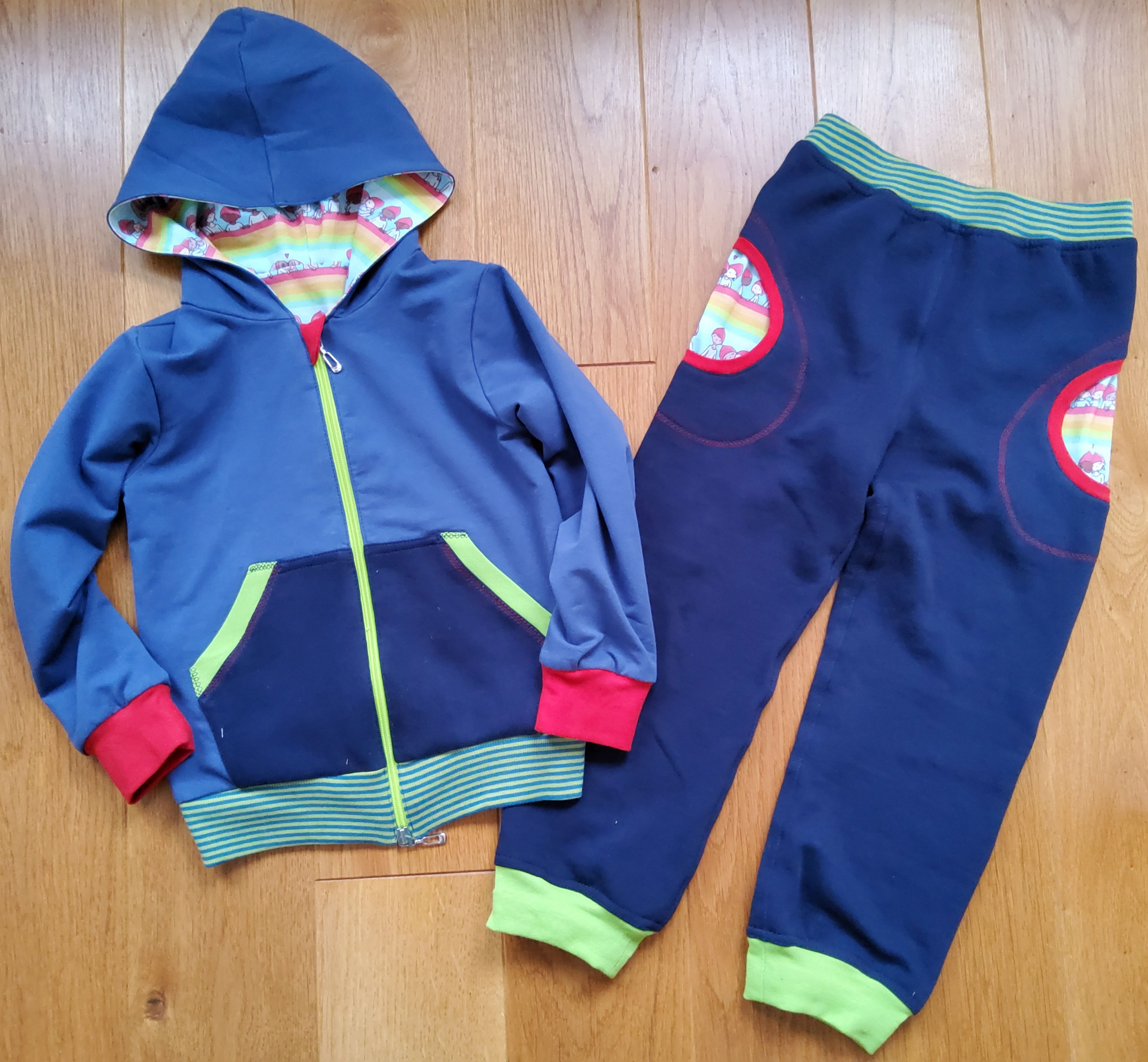 Genäht habe ich die Zipperjacke aus dem Klimperklein Buch (Nähen mit Jersey) sowie eine Jogging Rockers Kids von MamaHoch2.
