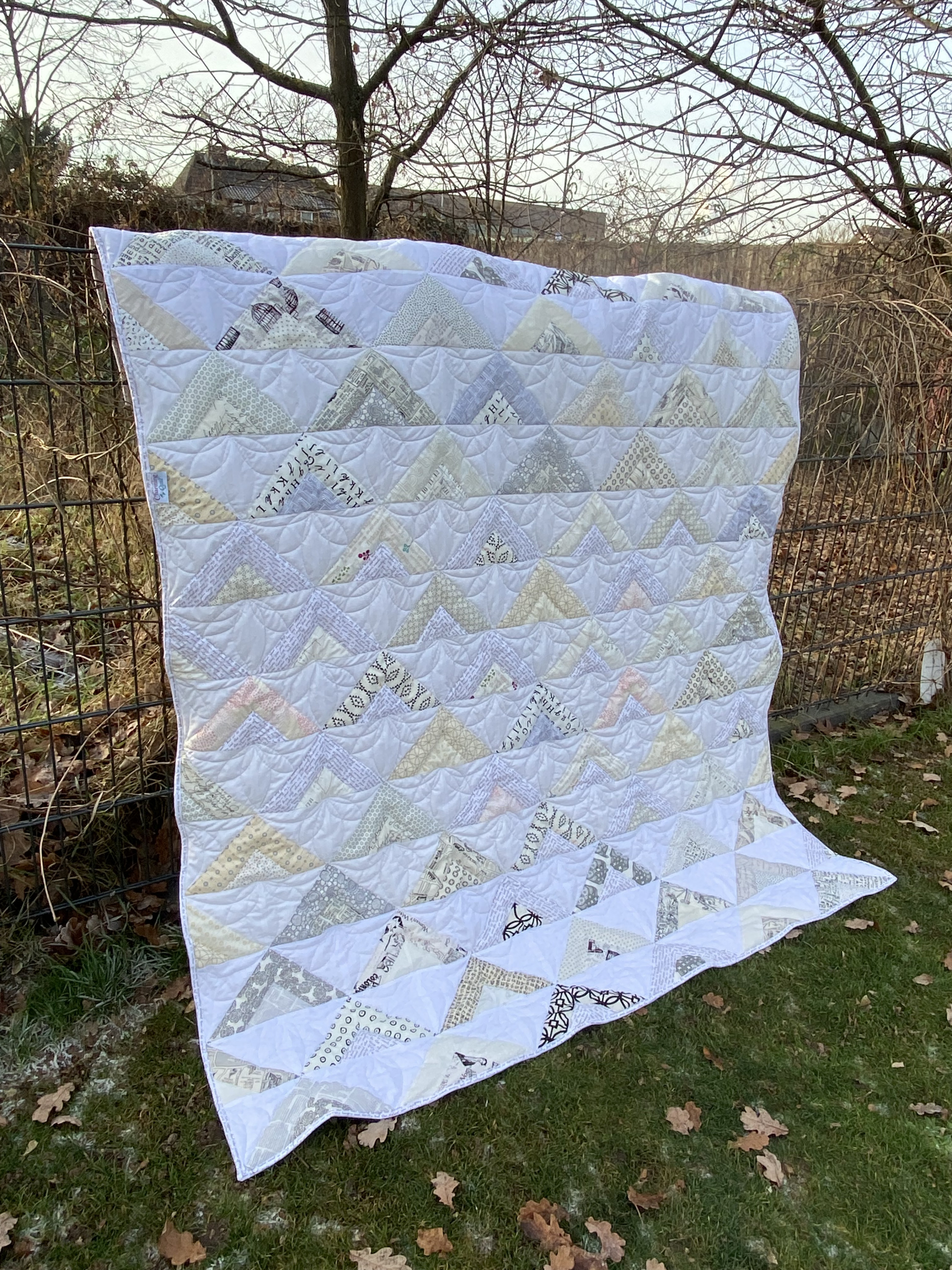 Gequiltet wurde wie in der MQS vorgeschlagen: die Dreiecke habe ich stitch-in-the-ditch mit dem Ruler gequiltet und in den weißen freien Dreiecken habe ich dann freihand die Blüten gequiltet. Das Batting ist reine Baumwolle von Freudenberg und die Rückseite ist ein Punkteminky in hellgrau.