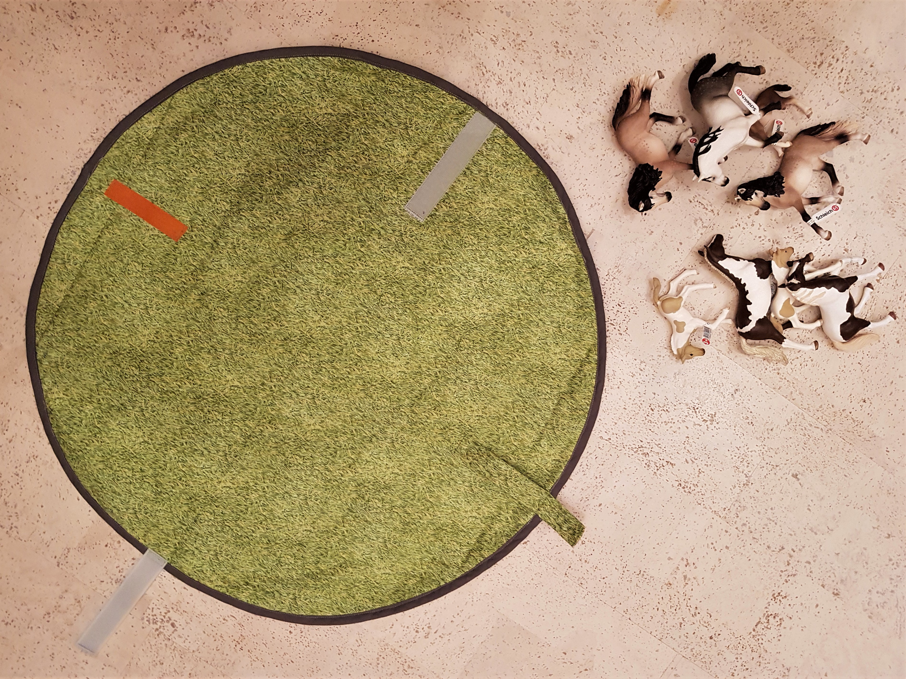 Für ihre Schleichpferde bekam unsere Enkelin eine genähte Pferdewiese mit Teich (Thermolamfüllung und applizierte Hologrammfolie in Wachstuchstärke) mit Klettverschlüssen und Tragegriff.